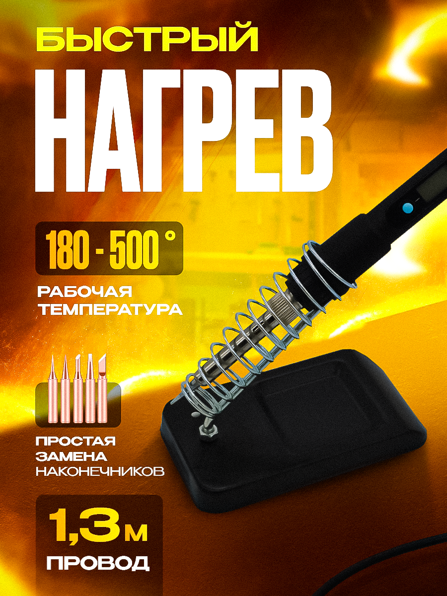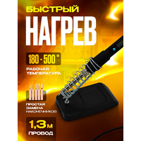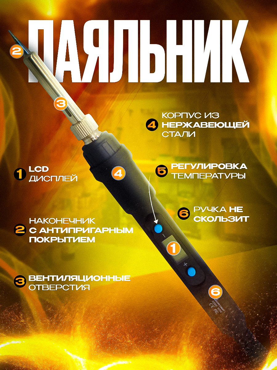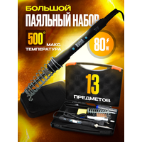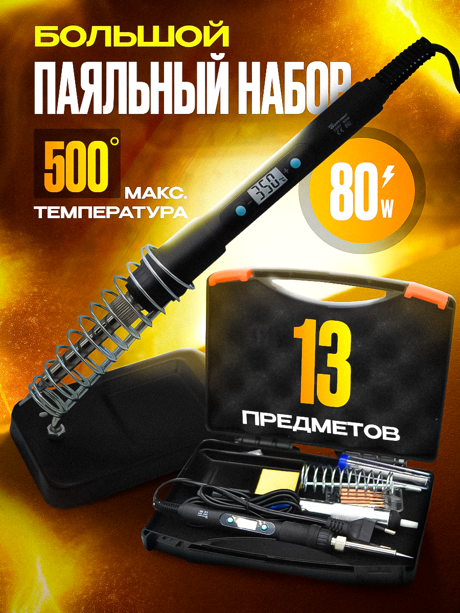 Электрический паяльник 80 Ватт, цифровой, с регулировкой температуры, ЖК дисплеем. Паяльный набор в пластиковом боксе для хранения и переноски, со всеми необходимыми принадлежностями. В комплекте есть все нужные аксессуары, Вы можете начать работу немедленно. Если Вы радиолюбитель, начинающий или опытный, и ищете надежный и эффективный инструмент для своих целей, то наш набор для работы и ремонта Вам обязательно понравится. Благодаря регулировке температуры, Вы можете выбрать оптимальный нагрев для каждого конкретного случая. Керамический нагреватель обеспечивает быстрый и эффективный нагрев. Удобная эргономичная ручка позволяет надежно удерживать устройство в руках в течение длительного времени. Работает от сети 220В, вилка стандартная. Это отличный выбор для профессионалов и новичков, простой в использовании, обладает достаточно высокой производительностью. Прилагающиеся жала позволят Вам паять различные материалы и создавать соединения любой сложности в самых труднодоступных местах. В паяльном наборе Вы найдете подставку, которая сильно облегчает процесс пайки, на ней есть губка, чтобы вытирать жало, очищать его от остатков припоя. Есть 5 насадок наконечников, различных форм. Также имеется два пинцета с тефлоновым диэлектрическим покрытием, чтобы фиксировать элементы печатных плат. Наш набор содержит припой, специальный сплав готовый к использованию – кислота для пайки не требуется. Олово в виде спиральной проволочки, упакованное в пластиковую трубку с отверстием. Это очень удобно и экономично, хватит на долгое время. Есть оловоотсос, весьма полезное приспособление, которое сильно облегчит Вам работу. Все это помещено в прочный пластиковый бокс с ручкой, удобный для переноски и хранения. Он компактный и удобный, занимает минимум места. Наш набор для пайки будет полезным приобретением для любого мастера, а также замечательным подарком.