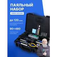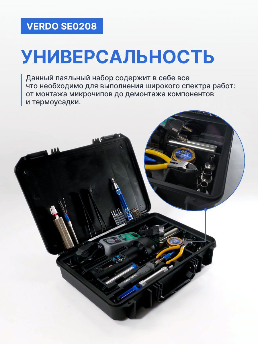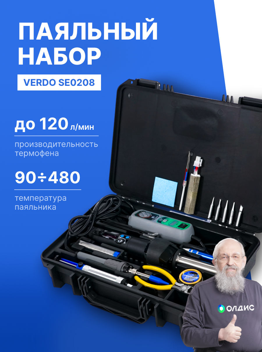 Паяльник электрический профессиональный VERDO SE0208 + термофен, набор 18 предметов в кейсе, 65 Вт, для пайки и монтажа: сравнение цен, характеристики, фото, актуальное наличие и цены.