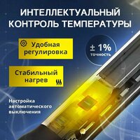 Паяльник FNIRSI HS01 65 Вт с керамическим нагревателем – это умный электрический электрический мини-паяльник, предназначенный для ремонта пластика и для пайки микросхем. Он имеет керамический нагреватель, который обеспечивает быстрое нагревание паяльника всего за 6 секунд. Это существенно экономит время при выполнении пайки и повышает эффективность работы. Когда электропаяльник для пластиковых элементов не используется, он автоматически охлаждается и выключается, что делает его очень безопасным. Также строительный электро инструмент с регулировкой температуры для мужчин имеет регулируемый замок (блокировку) для детей. Благодаря этому паяльник fnirsi можно использовать как на производстве, так и в домашних условиях. Диапазон температур паяльника составляет 80-420 °C. Благодаря этому пользовать может самостоятельно выбрать оптимальный показатель для различных материалов и задач. Например, более низкая температура используется для пайки чувствительных компонентов, тогда высокая температура может быть необходима для выполнения более сложных задач. Калибровка температуры до 50ºС позволяет точно настроить паяльник в соответствии с требуемыми параметрами. Это особенно полезно для технических специалистов, которые работают с определенными стандартами температуры при выполнении пайки. Важной деталью является и возможность выбора языка: английский или китайский.