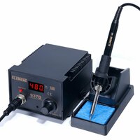 Антистатический паяльник с цифровой индикацией и аналоговой регулировкой температуры. Трехзначный светодиодный индикатор отображает фактическую температуру жала паяльника. Микропроцессорное управление обеспечивает высокую стабильность температурного режима. Ручная регулировка температуры обеспечивает дополнительное удобство в работе. Биметаллическое долговечное жало паяльника при необходимости может быть легко заменено на жало с другой конфигурацией рабочей поверхности. Напряжение питание 220 В 50 Гц Потребляемая мощность: 50Вт Сопротивление заземления жала: <2 Ом Падение напряжения на заземлении: <2 мВ Нагревательный элемент: керамический Длина шнура: 1,2м Длина ручки паяльника: 190мм Вес (без шнура): 45 гр Паяльная станция Выходное напряжение: 24В Температурный диапазон 200-480°C Погрешность установки температуры: ±10°C.