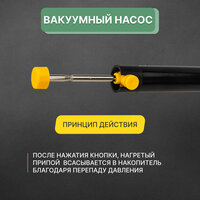 Паяльник с вакуумным отсосом 220В 40Вт REXANT HT-019 ZD-210 12-0171 предназначен для бытового использования - ручного монтажа радиодеталей при ремонте электроники. Наибольшее применение это устройство нашло при разборке и демонтаже электронных плат и выпаивания с их рабочей поверхности отдельных элементов. Данная модель имеет вакуумный отсос, который эффективно втягивает расплавленный припой. Устройство оснащено эргономичной рукояткой, корпус которой изготовлен из нескользящего пластика с ударопрочными свойствами.