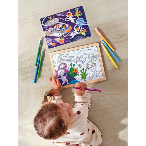 Пазл-раскраскадля малышей «Космические друзья», в рамке. Это сборная иллюстрация из 48 элементов с одной стороныи занимательная раскраска с другой. Подходит для раскрашивания акварелью, цветными карандашами, красками, фломастерами и, даже, пальчиками. Соберите с ребёнком яркую картинку с отважными юными космонавтами, затем переверните её, и вы обнаружите новую картинку с контурами для раскрашивания. Ваш малыш узнает, как выглядит космос, забавные инопланетные существа и сможет раскрасить их по своему вкусу.