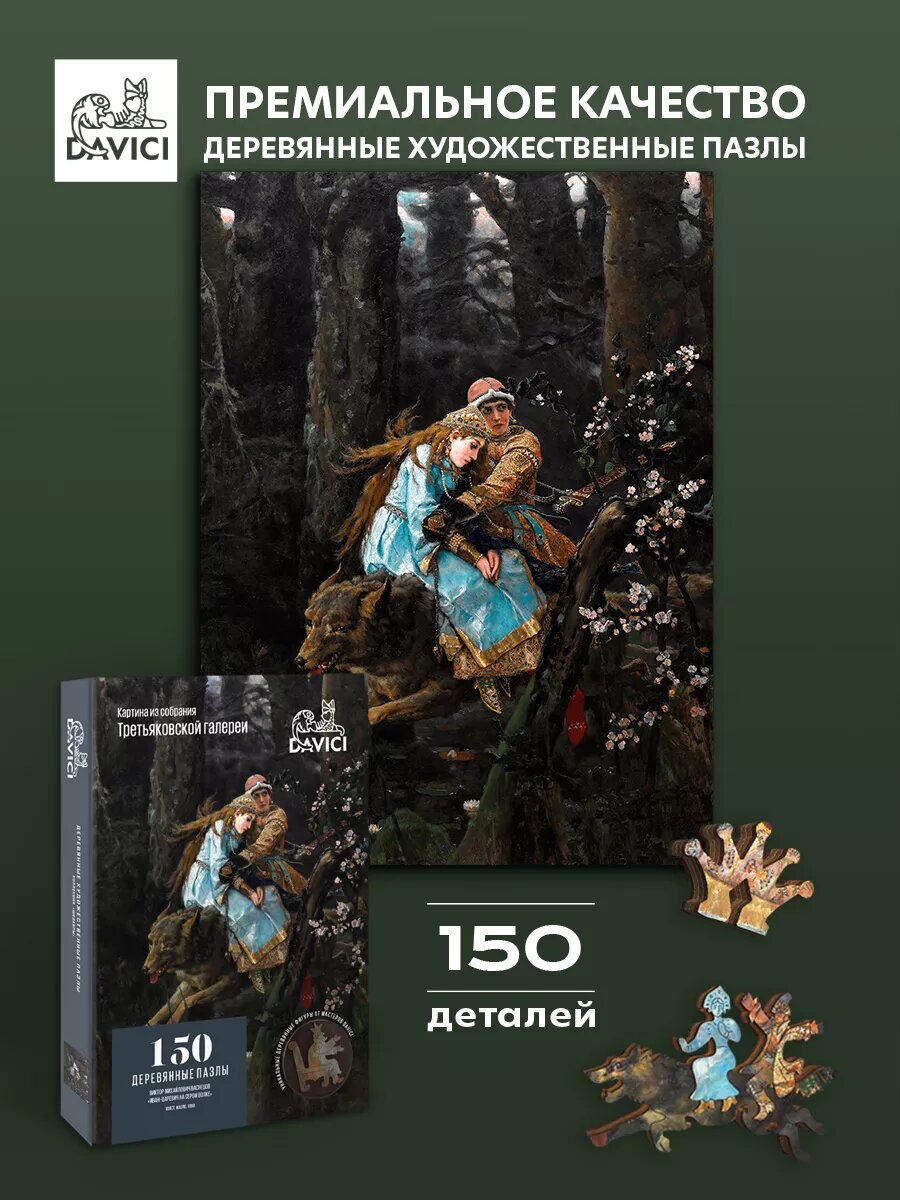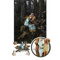 Знакомые каждому символы русских сказок открываются среди фигурных деталей пазла в лубочном стиле. Волшебная жар-птица, вороной конь, живая и мертвая вода, меч – кладенец, дерево с молодильными яблочками, сказочный царь, три богатыря, волки – оборотни и сам Иван Царевич с царицей на сером волке. Найдите резное перо среди деталей пазла и разместите на нем фигуру жар-птицы, чтобы собрать личную птицу счастья и разгадать загадку набора. Загадка: Жар-птица встаёт в подставку в виде пера.
