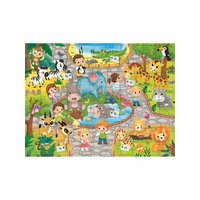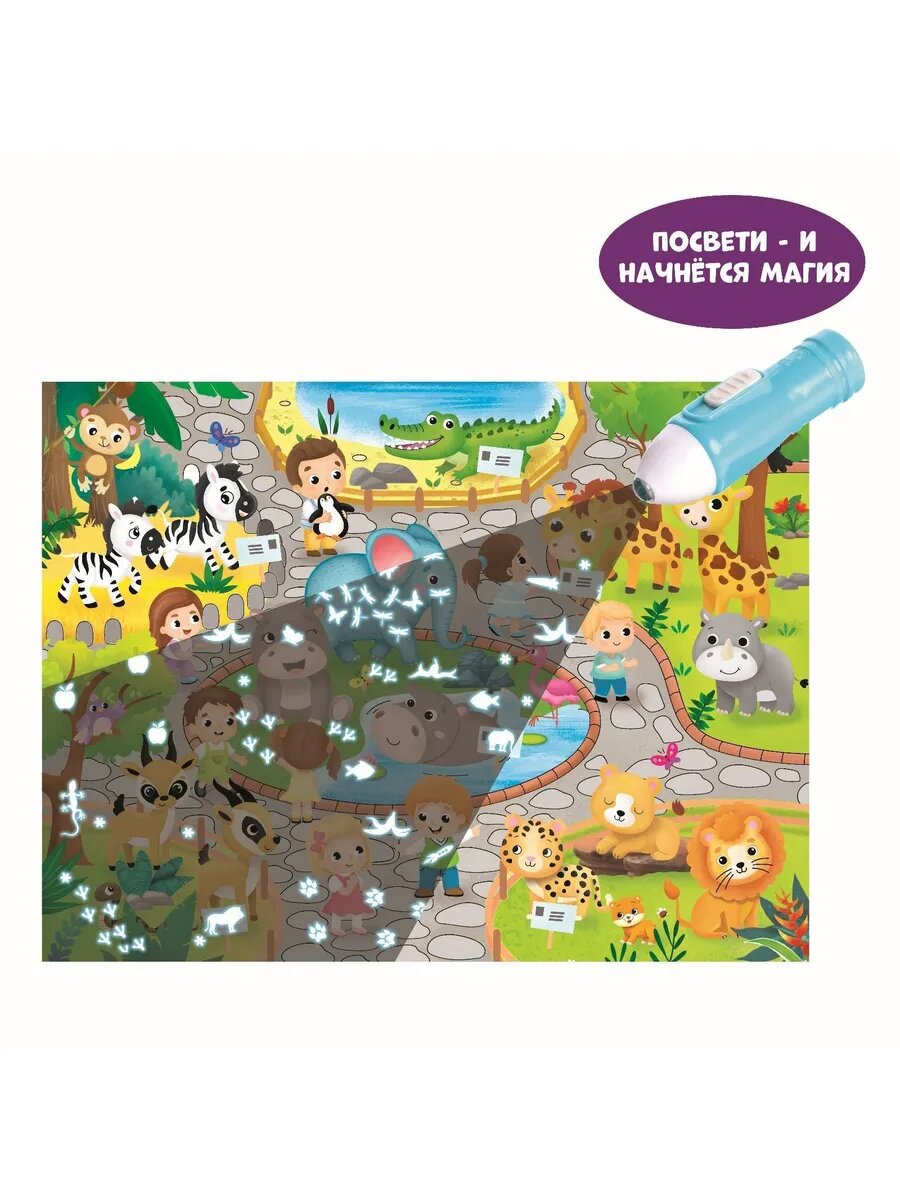 Перед вами не просто пазл, а волшебная игра-головоломка! Необычные элементы привлекают внимание и стимулируют познавательную активность на более высоком уровне, чем классические пазлы. Соберите картинку и отыщите спрятанные на ней секреты. В этом вам поможет ультрафиолетовый фонарик. Как разглядеть спрятанные изображения * Возьмите фонарик и посветите на любое место игрового поля. * В луче фонарика вы увидите яркие изображения. * Если выключить свет, изображения под лучом фонарика станут ярче. Ребёнка ждут увлекательные задания: 1. Какие таблички перепутали? 2. Кто из животных сбежал из вольера? 3. Кто побывал в каждом вольере? 4. Сколько стрекоз сидит на слоне? 5. Сколько бананов съела обезьяна? 6. Чем девочка кормит жирафа? 7. У какой зебры ненастоящие полоски? Польза собирания пазлов для детей: * развивает логическое мышление и кратковременную память; * тренирует усидчивость и мелкую моторику рук; * учит различать цвета и находить связь между частью и целым. Комплектация * 88 деталей, * ультрафиолетовый фонарик. Дополнительно Размер собранного пазла: 40 × 30 см. Размер одной детали: 3.5 × 3.5 см. Фонарик работает от 3 батареек типоразмера AG3. Батарейки в комплекте. Рекомендовано детям от 3 лет.