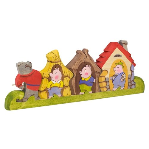 Деревянный пазл Три поросенка, Сказки дерева08010 -композиции-пазлы выпилены из целого куска дерева и образуют единое целое. Пазл "Три поросенка" состоит из 10 частей. Животные в композициях представляют собой целые (не разделенные на части, как в картонном пазле), художественно законченные фигурки и являются полноценным игровым материалом. Каждый элемент пазла расписан нашими художниками вручную со всех сторон. Особенности:- в наборе 10 деталей: опушка, 5 деталей домиков, 3 поросенка, волк-фигурки могут стоять на столе- края деталей сглажены- детали гладкие, чуть шероховатые на ощупь- окрашены вручную безопасными красками в спокойных тонах- домики, поросята и волк вставляются в опушку-основаниеДеревянный пазл Три поросенка, Сказки дерева08010 -примечательно, что соломенный и деревянный домики складываются из двух частей и можно легко обыграть момент, когда волк сдувает и разрушает эти домики. Как играть? Это набор позволяет собрать объемный пазл и разыгрывать с фигурками сценки из сказки. Детки постарше смогут не просто собрать пазл, но и инсценировать всю историю, что разовьет не только воображение, логическое мышление, но и нравственные качества ребенка. Собирая пазл, вы можете устроить для своего малыша целое театральное представление. Отдельной игровой задачей служит собирание композиции в единое целое и здесь она играет роль головоломки - пазла, развивает мышление, умение видеть целое, как состоящее из отдельных предметов, то есть учит анализу. Дети постарше могут использовать пазл для своих сюжетных игр, развивая речь, воображение и актёрские способности. Игра с пазлом учит детей ответственности