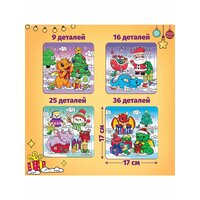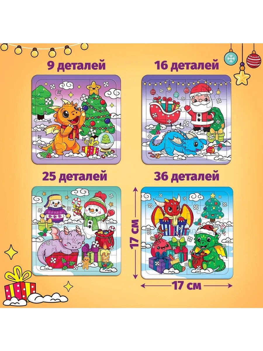 - Ребёнок соберёт 4 квадратных пазла с новогодней тематикой.