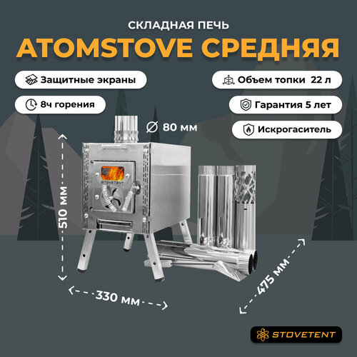 Печь ATOMSTOVE Средняя - это портативная складная печь для обогрева помещений (палаток). Печь выполнена из нержавеющей стали толщиной 0,8 мм Aisi 430. Ножки печи - алюминиевая труба.