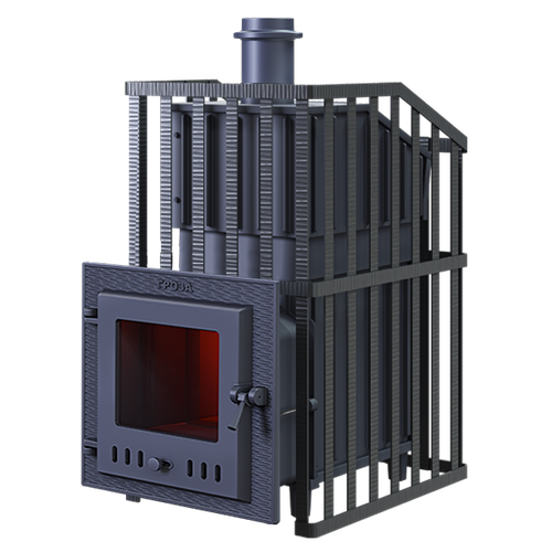 Печь для бани Гроза Ураган - расширенный комплект печи в сетке. Максимально приближенный вариант печи для режимов русской парной, имеющий непосредственно закрытую чугунным коробом каменку, дверцу для пара с ручкой из бука, увеличенную до 50см чугунную стартовую трубу. Печь легко модернизируется до полноценной печи предназначенной для Русской бани путем замены стальной сетки на каменную облицовку без демонтажа дымохода. Модель Гроза Ураган выполнена на базе топочного агрегата Гроза - экономичная модель для частного применения. Основной принцип работы печи сохранён – получение пара с теплоёмкой каменки прямого нагрева. Каменка является сводом топки, нагревается с нижней поверхности снабженной теплосъемными шипами для увеличения контакта с пламенем.
