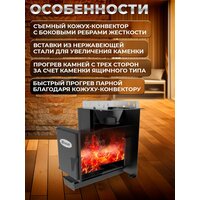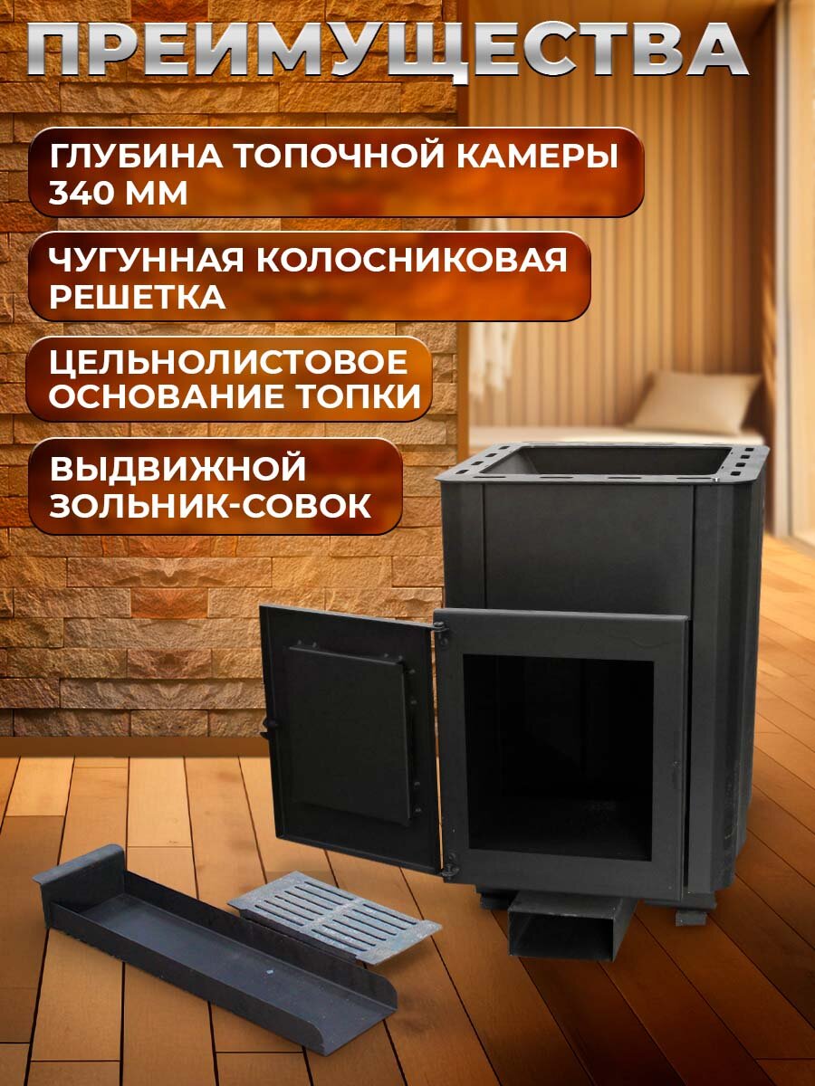 Кожух конвектор – обеспечивает быстрый прогрев парильного помещения. Окрашен термостойкой краской, выдерживающей воздействие высокой температуры до 1000°С. Топка снабжена чугунным колосником. Выдвижной зольный ящик - позволяет регулировать интенсивность горения и удалять золу, не прерывая горение Каменка ящичного типа позволяет прогревать камни с трех сторон быстро и эффективно. Увеличен объем каменки за счет дополнительного съемного элемента –кожух - каменка. Выполнен из нержавеющей стали. Патрубок - толщиной 6мм, сталь 09Г2С. Не только топка, но и топливный канал изготовлены из котловой стали 09Г2С, толщиной 3мм.