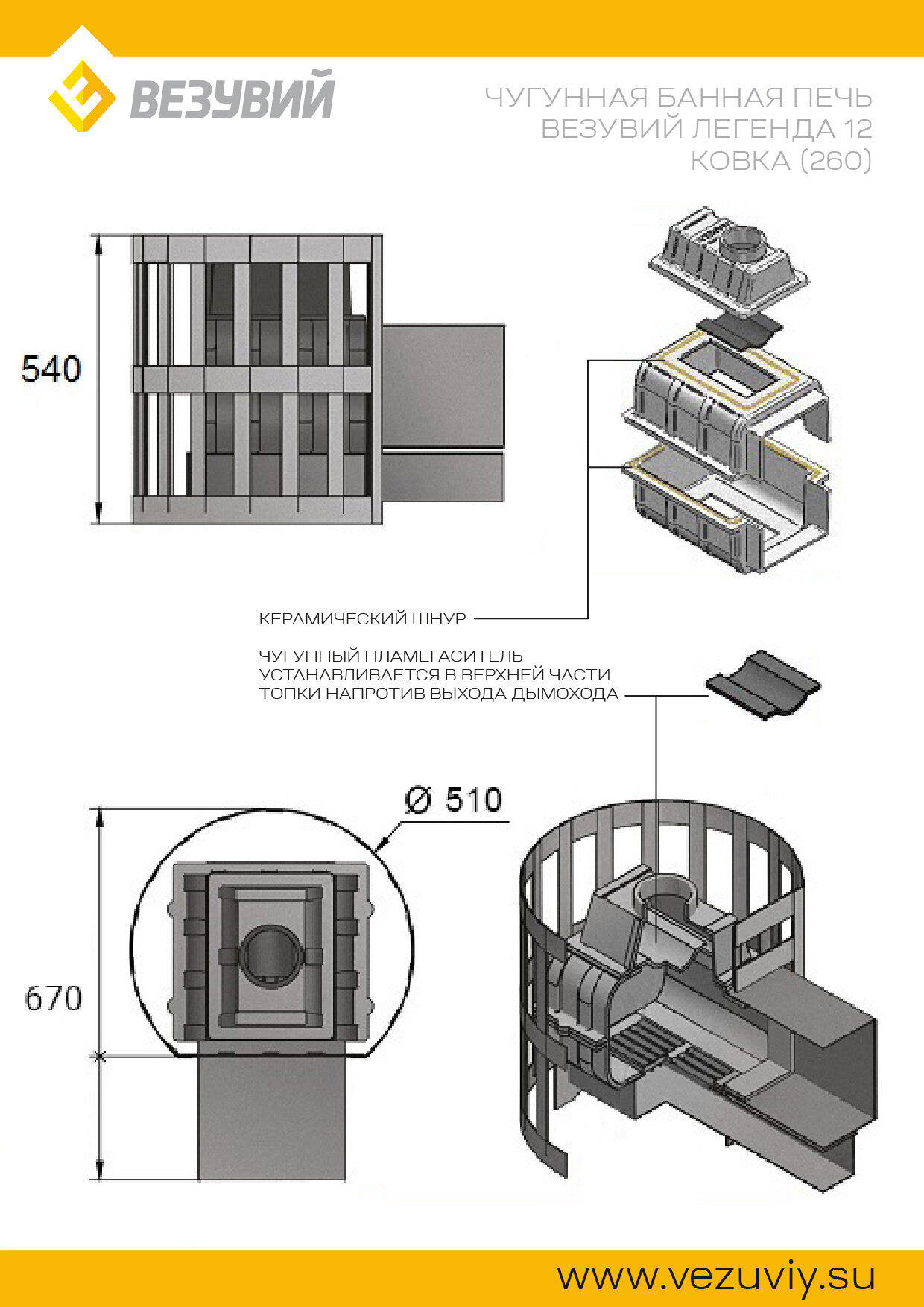 Преимущество печи в том, что топка печи состоит из 3-х элементов. На стыке между ними используется керамический шнур с рабочей температурой 1200 градусов. То есть топка печи абсолютно герметична! Для фиксации деталей между собой применяется болтовое соединение, что даёт 100% гарантию безопасности при эксплуатации. Банная чугунная печь Легенда Ковка 12 (260) укомплектована чугунной герметичной дверцей Везувий 260 с жаропрочным стеклом «SCHOTT ROBAX». Конвекционно-вентилируемый кожух "Ковка" изготовлен из металлической текстурированной полосы покрашенной термостойкой краской и покрытая патиной «Бронза». Серия: Легенда Материал: Чугун Объем отапливаемого помещения: 12 м3 Водяной контур: Нет Выносной туннель: Есть Каменка: Сетка (открытая каменка) Тип дверки: Со стеклом Вес камней: 90 кг Диаметр дымохода: 115 мм Вес Брутто: 81.6 кг Ширина: 510 мм Высота: 540 мм Глубина: 670 мм