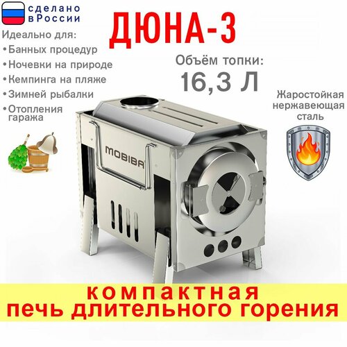 Печь длительного горения "Дюна-3" от бренда Мобиба — это компактное и надёжное решение для обогрева палаток, дачных домиков, гаражей, бытовок и временных построек. Подходит для зимней рыбалки, охоты, туризма и кемпинга. Благодаря своей конструкции, печь может использоваться как отопительно-варочная: на верхней поверхности можно готовить пищу и кипятить воду.