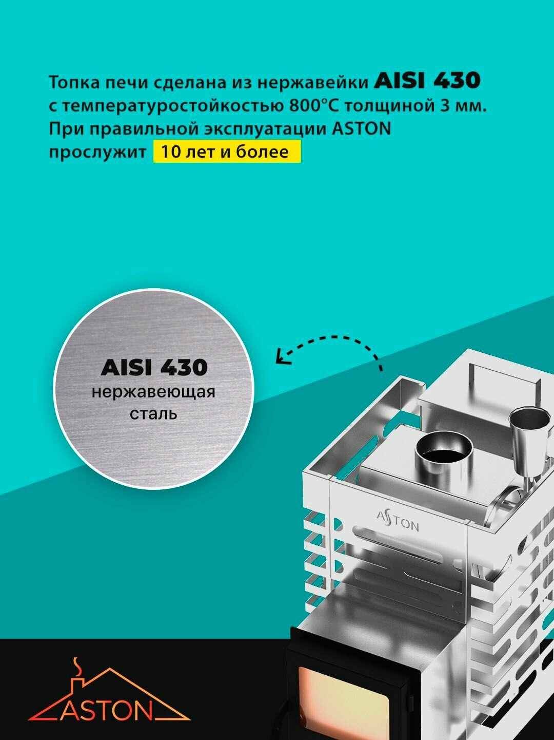 В целом, печь для бани ASTON 12 INOX стекло "аква" - надежное, функциональное и стильное решение для вашей бани.