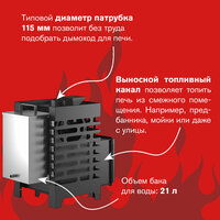 Печь оснащена стальным кожухом-конвектором, который значительно ускоряет нагревание воздуха в парилке. Топочная дверка с регулировкой подачи воздуха позволяет контролировать процесс горения и температуру в парилке.