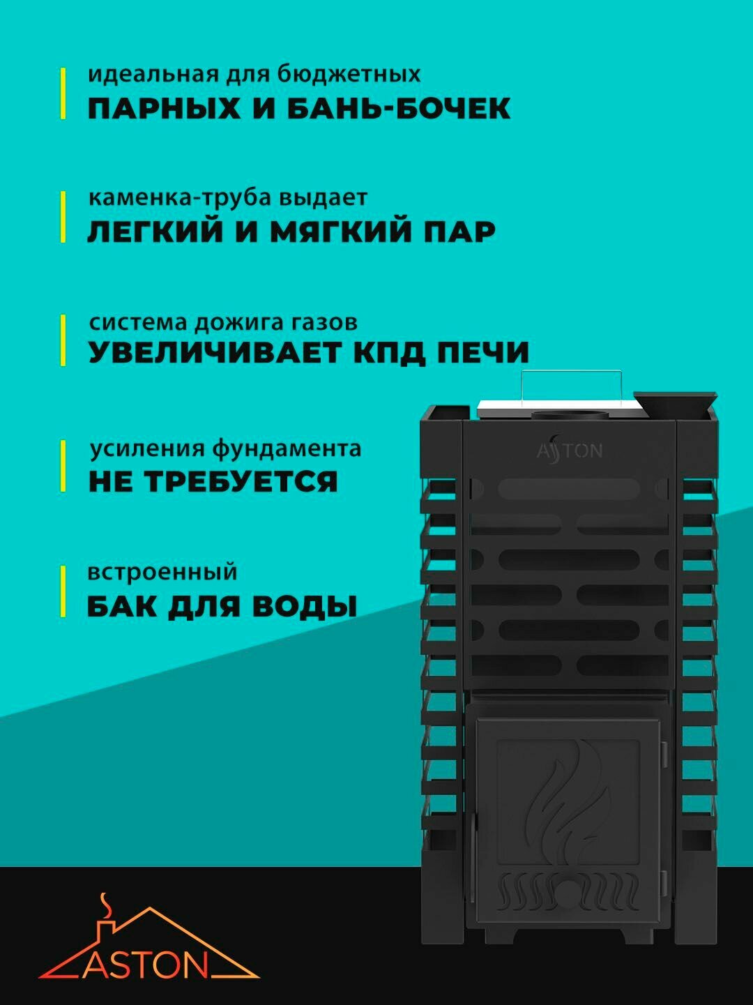 - ASTON — бренд банных печей для бюджетных парных и бань-бочек. Несмотря на доступную цену, их конструкция очень интересна:
