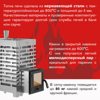 Материал дверцы печи - стекло, что придает ей стильный и современный вид. Серебристый цвет корпуса и дверцы гармонично сочетается с любым интерьером бани или сауны.