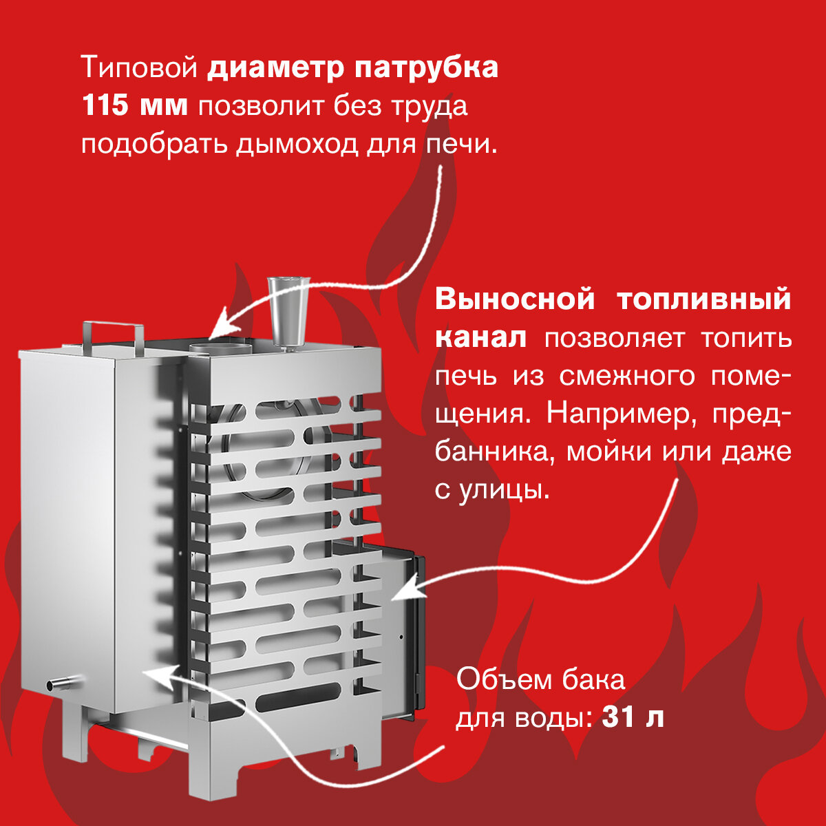 Печь предназначена для использования в качестве основного источника тепла в помещении. Она способна отапливать объем до 18 м³, что делает ее подходящей для небольших бань и саун.