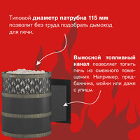 Печь для бани везувий Лава 16 Панорама 2022 - это высококачественная дровяная печь, предназначенная для нагрева пространства парной и получения пара. Топка печи изготовлена из особо прочной котловой стали марки 09Г2С, что обеспечивает долговечность и надежность конструкции. Толщина верхней и задней части топки составляет 6 мм, а боковых стенок - 4 мм. Скошенные углы в нижней части боковых стенок топки облегчают уход за печью и предотвращают высокую тепловую нагрузку на стенки. Дожиг вторичных газов обеспечивается посредством широкого П-образного профиля на задней поверхности топки, что увеличивает КПД печи и усиливает заднюю стенку. Кожух из стального листа и кованых стальных колец обеспечивает конвекцию устройства открытой каменки и защищает парящихся от жесткого инфракрасного излучения. В верхней части кожуха сделаны прорезные отверстия в виде языков пламени для усиления движения воздуха. Чугунные детали, такие как колосник и пламегаситель, противостоят высокой температуре и не меняют своей геометрии во время топки. Зольный ящик совкового типа удобен для уборки печи и удаления золы. Чугунный пламегаситель является съемным элементом, что облегчает прочистку печи. Печь обеспечивает возможность горения дров в тоннеле, выполненном из стали 4 мм. Дно тоннеля расположено на одном уровне с дном топки для беспрепятственного перемещения углей в глубь топки. Важные преимущества банных печей серии Лава включают особо прочную котловую сталь марки 09Г2С, чугунный пламегаситель и стальную топочную дверь. Конвекционно-вентилируемый кожух вмещает до 50 кг камней, обеспечивая комфортное пребывание в бане. Печь для бани везувий Лава 16 Панорама 2022 работает на дровах и рассчитана на объем парной 8.0 кубометров. Установка печи напольная, а подключение к дымоходу верхнее. Цвет товара - черный.