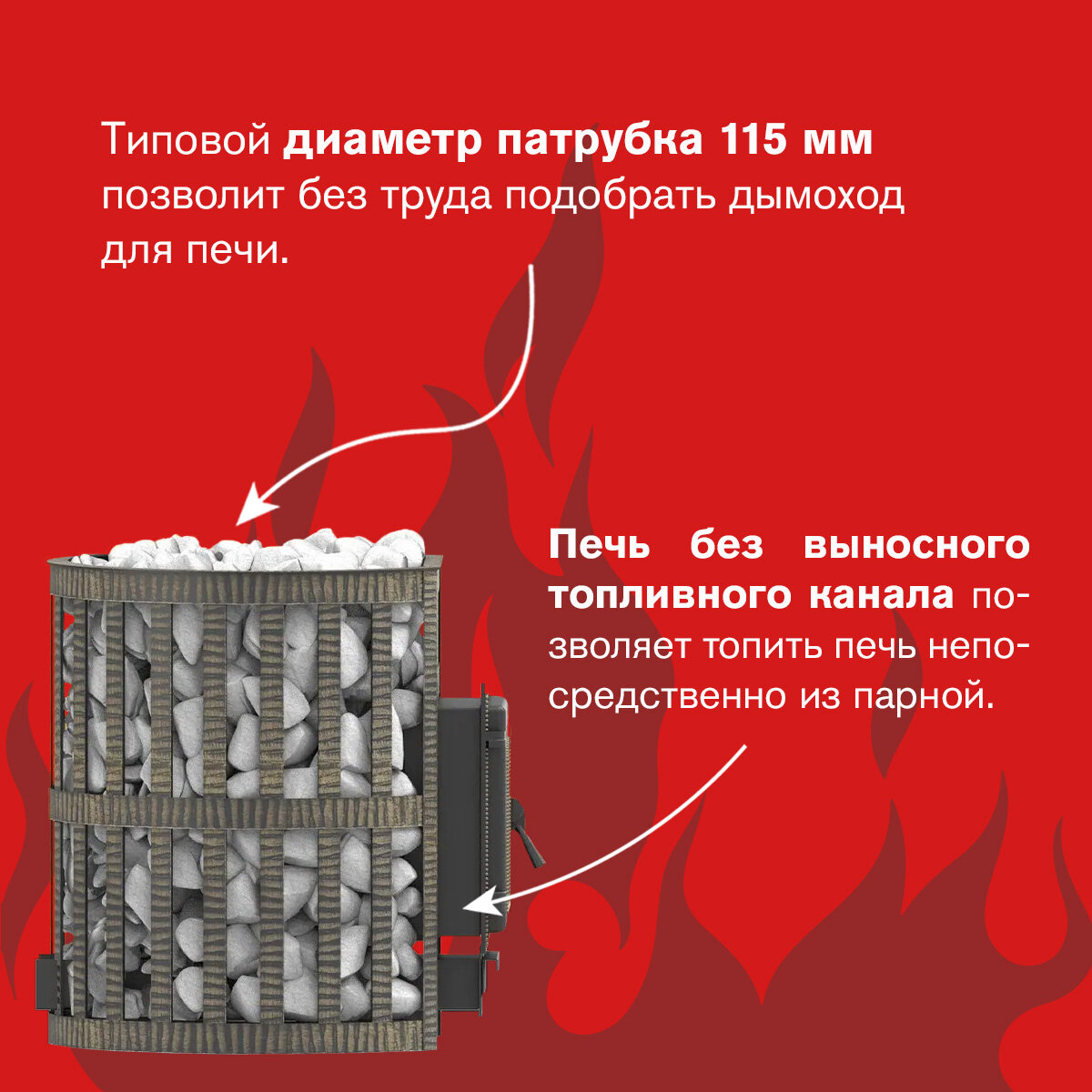 Размеры печи для бани - ширина 560 мм, высота 620 мм, глубина 560 мм. Диаметр дымохода в 115 мм обеспечивает надежную тягу и эффективный вывод дымовых газов, а отсутствие выносного туннеля делает монтаж более простым и быстрым.