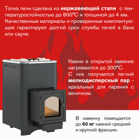 Банная печь везувий Русичъ Антрацит 22 (ДТ-4С) 2022 - это конвекционная печь, изготовленная из особо прочной котловой стали марки 09Г2С толщиной 4-6 мм. Она предназначена для установки в парных объемом от 12 до 24 кубических метров. Особенностью данной модели является наличие скошенных углов в нижней части боковых стенок топки. Это упрощает уход за топочным пространством и повышает эффективность сгорания дров. На задней поверхности топки расположен канал для подачи вторичного дожига, который существенно усиливает горение в верхней части печи и повышает количество получаемой от топлива энергии. Стальной кожух печи оснащен прорезными отверстиями в верхней части, что улучшает конвекцию и обеспечивает нагрев воздуха в парной. Банная печь оснащена открытой каменкой, которая устраивается путем закладывания верхней части топки банными камнями. Для камней средней и крупной фракции предусмотрен внутренний короб с вертикальными отверстиями. Дверка, пламегаситель и колосник печи изготовлены из чугуна, что увеличивает их прочность и срок службы. Интенсивность подачи воздуха в зону горения регулируется зольным ящиком совкового типа. Печь имеет островную конструкцию и подключается к дымоходу через верх. Ее размеры составляют 74,3 см в высоту, 42 см в ширину и 71,5 см в глубину, а вес - 100 кг.