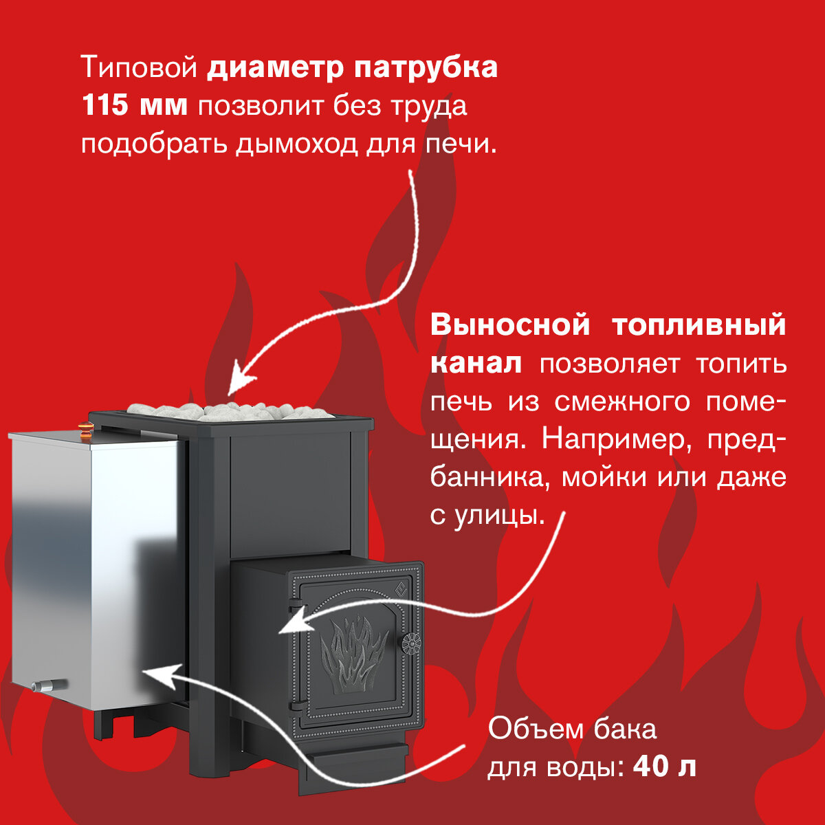 Печь для бани везувий Сенсация аква 22 (ДТ-4) – это высококачественная дровяная печь, которая станет незаменимым атрибутом для любителей бани. Особенностью данной печи является топка, состоящая из трех элементов. Между ними используется керамический шнур с рабочей температурой 1200 градусов, что делает топку абсолютно герметичной. Для фиксации деталей между собой применяется болтовое соединение, что обеспечивает 100% безопасность при эксплуатации. Объемная, вентилируемая каменка печи позволяет максимально быстро нагреть камни с четырех сторон в кратчайшие сроки. Большая масса камней, закладываемая в каменку печи, нагревается до 350 °С, обеспечивая стабильность температуры в парилке и являясь мощным парогенератором. Поверхность нагрева печи охвачена сверхъемким наружным конвекционно-вентилируемым кожухом, что значительно ускоряет нагревание воздуха в парилке за счет образуемого им мощного конвекционного потока. Печь везувий Сенсация аква 22 (ДТ-4) укомплектована чугунной негерметичной дверцей Везувий ДТ-4. В комплектацию не входит навесной бак для воды, однако возможна установка двух баков одновременно. Печь имеет напольное исполнение и подключается к дымоходу через верхнее подключение. Материал корпуса и дверцы – чугун, что гарантирует долговечность и надежность конструкции. Печь для бани везувий Сенсация аква 22 (ДТ-4) имеет следующие размеры: ширина – 57 см, глубина – 68 см, высота – 68 см. Вес печи составляет 96,5 кг.