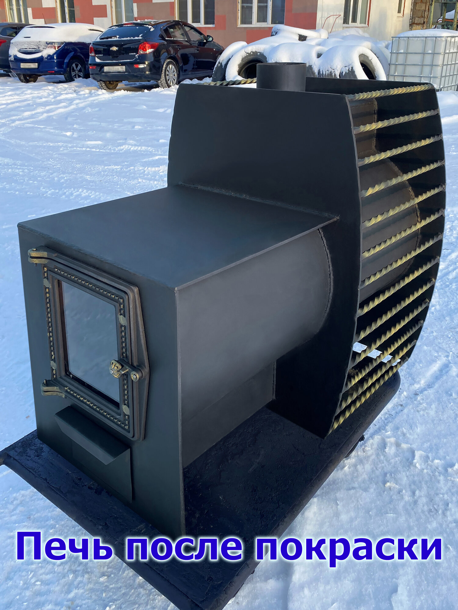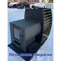 - Так же из чугуна выполнены дверца прочистная и колосник. Прутки каменки сделаны из стали СТ3. Остальные части печи из нержавейки. Печь окрашена в чёрный цвет.