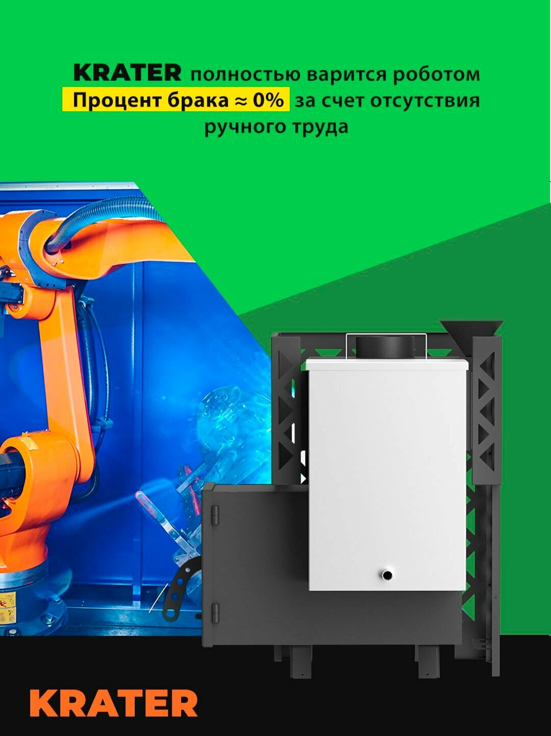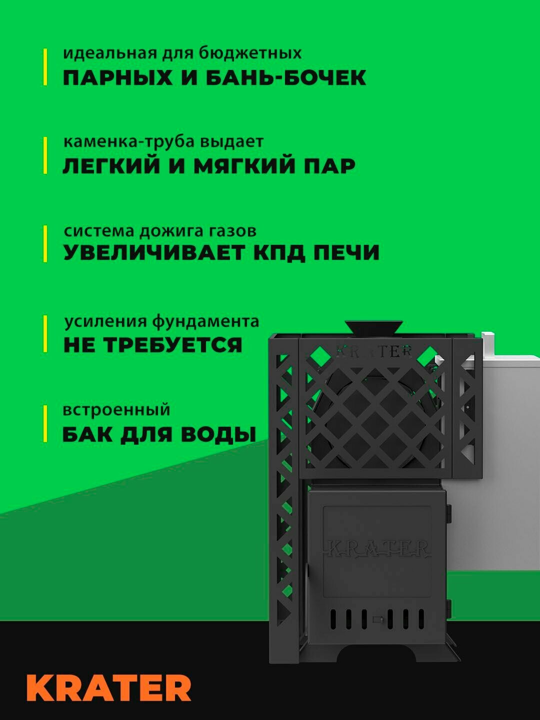 Печь для бани Кратер 12 с баком подходит для обогрева парных объёмом до 14 м3.