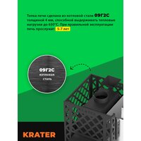 Сетка-каменка обрамляет топку и вмещает в себя 60-70 (+ 15) кг. камней. Также у Кратера есть внутренняя закрытая каменка, подача воды в которую осуществляется через воронку, вынесенную наверх. Такая каменка позволяет получать легкий и мягкий пар.