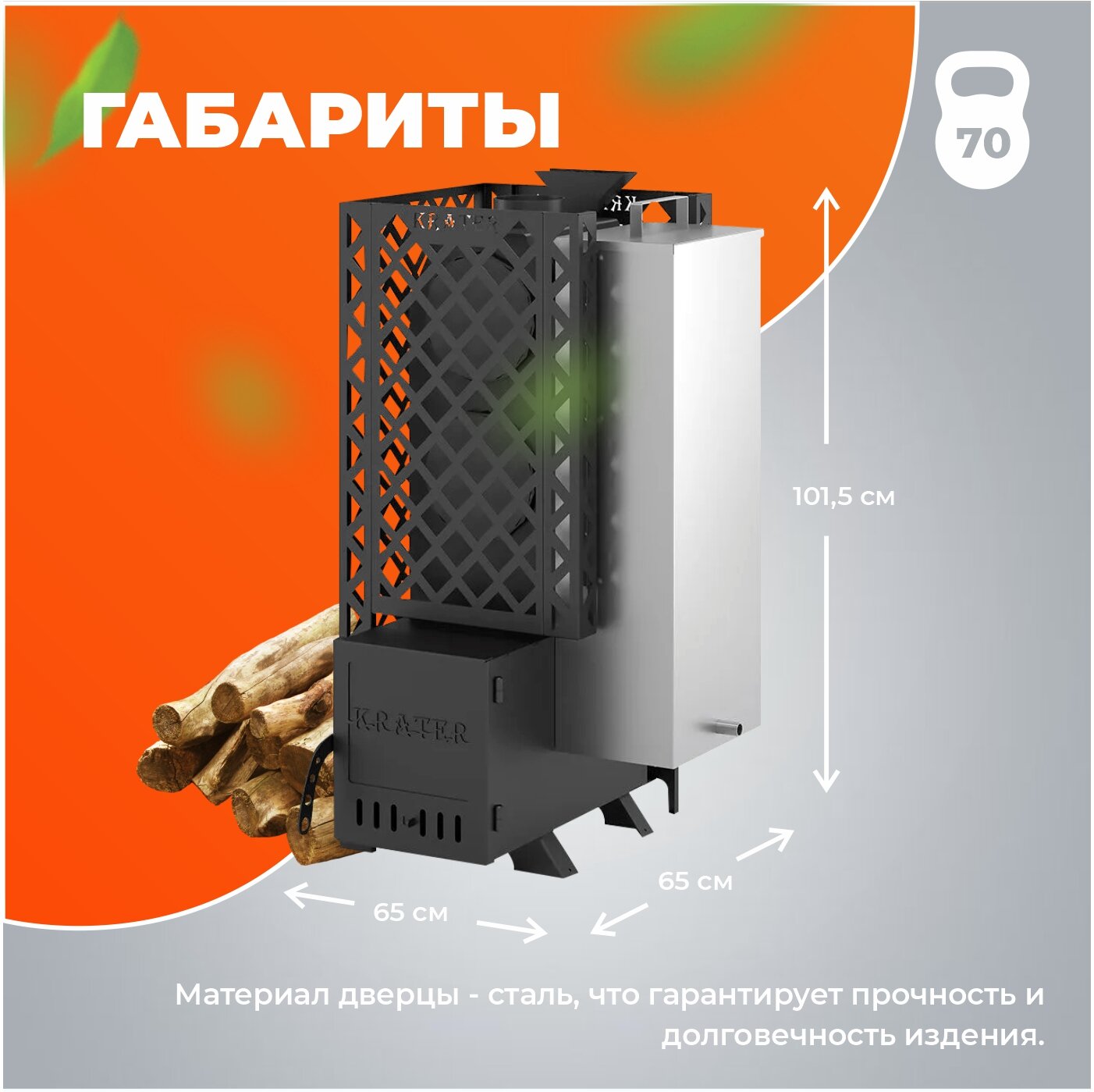 Печь для бани "Кратер 20" бак имеет следующие размеры: высота - 101,5 см, ширина - 65 см, глубина - 65 см. Вес печи составляет 70 кг. Подключение к дымоходу осуществляется сверху.