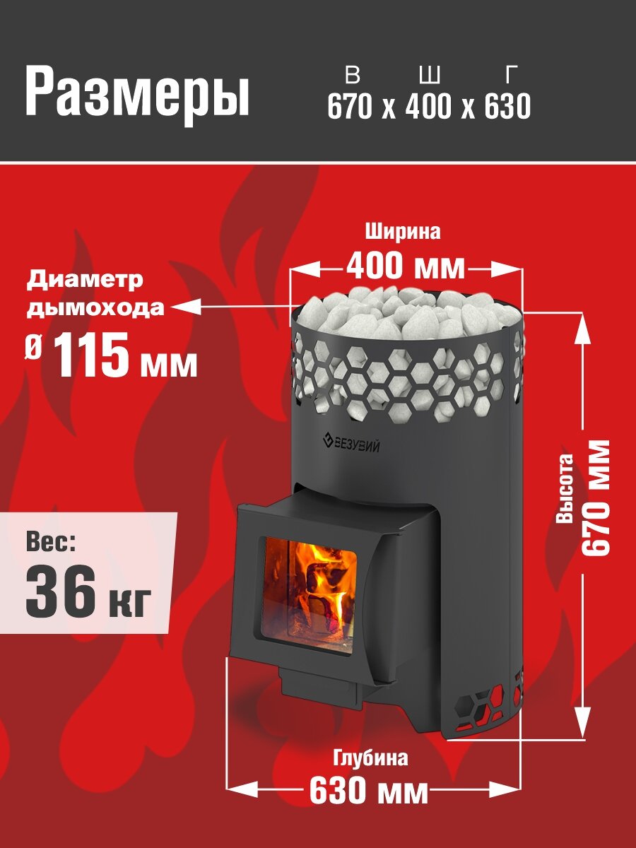 Печь для бани везувий "Черная Пчёлка С" - надежное решение для комфортного отдыха и парения в вашей бане Если вы ищете качественную и долговечную печь для бани на дровах, которая обеспечит тепло и уют в вашем парилочном помещении, обратите внимание на модель везувий "Черная Пчёлка С". Эта печь для бани производится в России из высококачественной котловой стали и подходит для прогрева помещений объемом до 14 кубических метров. Она идеально подойдет для любой русской бани, обеспечивая достаточно тепла и создавая приятную атмосферу для отдыха. Особенности модели: Материал: Котловая сталь марки 09Г2С - высокая прочность, долговечность и отличные тепловые характеристики. Объем отапливаемого помещения: 14 м3 - оптимальный размер для небольшой или средней бани. Топливо: Дрова и брикеты - экологичные и доступные источники энергии. Каменка: Открытая - быстро нагревается и равномерно распределяет тепло по помещению. Дверка: со стеклом - позволяет наблюдать за процессом прогрева и создает уютную атмосферу. Диаметр дымохода: 115 мм - обеспечивает хорошую тягу и безопасную работу печи. Вес: 36 кг - прочная, надежная конструкция, не требует постоянного обслуживания. Габариты: ширина - 400 мм, высота - 670 мм, глубина - 630 мм - компактные размеры позволяют легко установить печь в любом помещении. Почему стоит выбрать именно эту банную печь? Модель везувий "Черная Пчёлка" отличается современным дизайном в виде сот, что придает ей оригинальный внешний вид и облегчает уход за корпусом. Благодаря расположению двери под углом обеспечивается улучшенная загрузка дров, что значительно упрощает процесс топки и повышает эффективность отопления. Эта печь для бани на дровах отлично подходит для тех, кто ценит качество и длительный срок службы. Дровяная печь везувий "Черная Пчёлка" - отличный выбор для тех, кто ценит традиции и современное качество. Идеально для русской бани Если вы хотите преобразить свою баню в уютное место для отдыха, парения и общения, выбирайте печи для бани везувий. Они сочетают в себе надежность, эффективность и эстетичный дизайн.