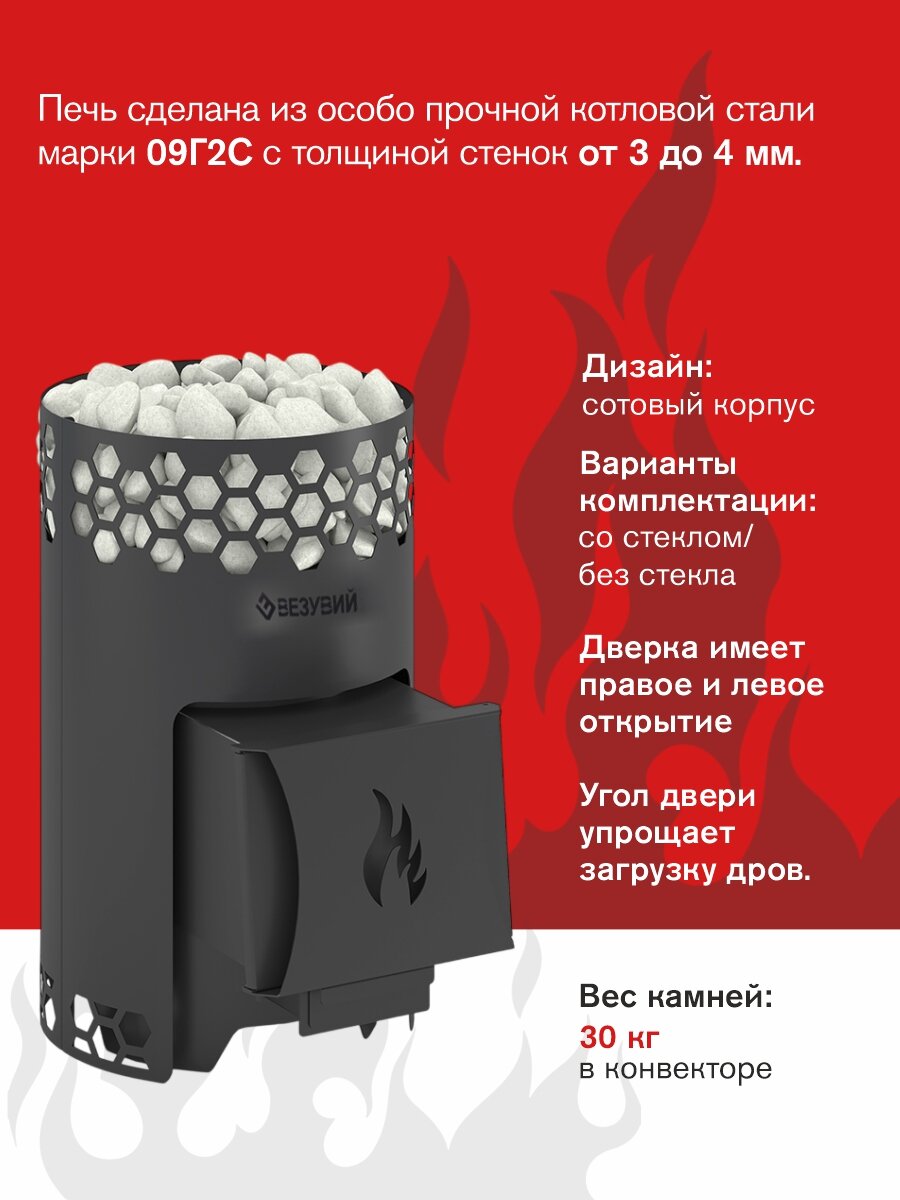 Печь для бани везувий "Черная Пчёлка" - надежное решение для комфортного отдыха и парения в вашей бане Если вы ищете качественную и долговечную печь для бани на дровах, которая обеспечит тепло и уют в вашем парилочном помещении, обратите внимание на модель везувий "Черная Пчёлка С". Эта печь для бани производится в России из высококачественной котловой стали и подходит для прогрева помещений объемом до 14 кубических метров. Она идеально подойдет для любой русской бани, обеспечивая достаточно тепла и создавая приятную атмосферу для отдыха. Особенности модели: Материал: Котловая сталь марки 09Г2С - высокая прочность, долговечность и отличные тепловые характеристики. Объем отапливаемого помещения: 14 м3 - оптимальный размер для небольшой или средней бани. Топливо: Дрова и брикеты - экологичные и доступные источники энергии. Каменка: Открытая - быстро нагревается и равномерно распределяет тепло по помещению. Дверка: со стеклом - позволяет наблюдать за процессом прогрева и создает уютную атмосферу. Диаметр дымохода: 115 мм - обеспечивает хорошую тягу и безопасную работу печи. Вес: 36 кг - прочная, надежная конструкция, не требует постоянного обслуживания. Габариты: ширина - 400 мм, высота - 670 мм, глубина - 630 мм - компактные размеры позволяют легко установить печь в любом помещении. Почему стоит выбрать именно эту банную печь? Модель везувий "Черная Пчёлка" отличается современным дизайном в виде сот, что придает ей оригинальный внешний вид и облегчает уход за корпусом. Благодаря расположению двери под углом обеспечивается улучшенная загрузка дров, что значительно упрощает процесс топки и повышает эффективность отопления. Эта печь для бани на дровах отлично подходит для тех, кто ценит качество и длительный срок службы. Дровяная печь везувий "Черная Пчёлка" - отличный выбор для тех, кто ценит традиции и современное качество. Идеально для русской бани Если вы хотите преобразить свою баню в уютное место для отдыха, парения и общения, выбирайте печи для бани везувий. Они сочетают в себе надежность, эффективность и эстетичный дизайн.