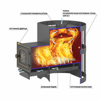 Чугунная дверца и чугунный колосник обеспечивают долгий срок службы и высокую теплоотдачу.