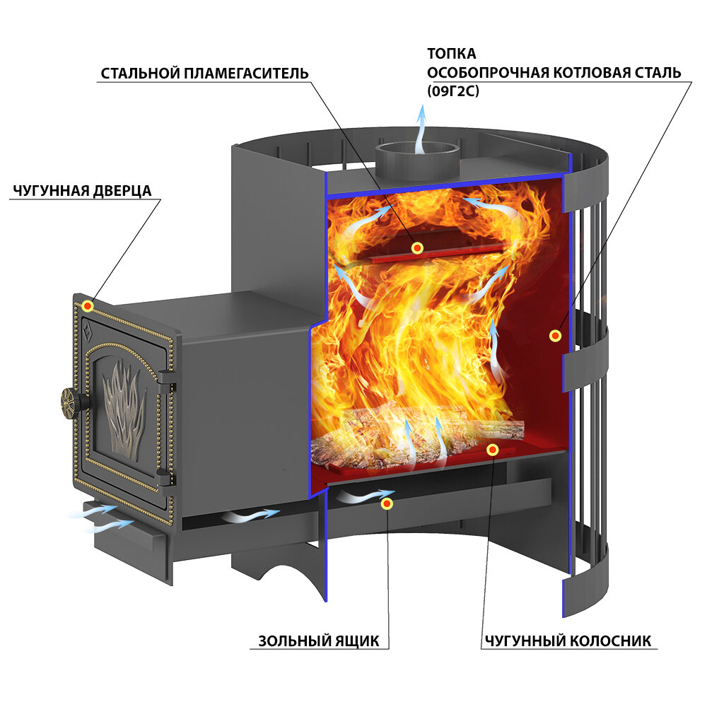 Чугунная дверца и чугунный колосник обеспечивают долгий срок службы и высокую теплоотдачу.