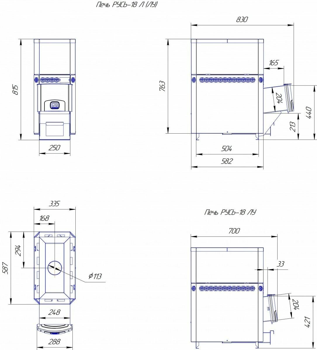 Выход дымовой трубы смещен от края к центру каменки (кроме Русь-9Л), что значительно упрощает монтаж дымохода.