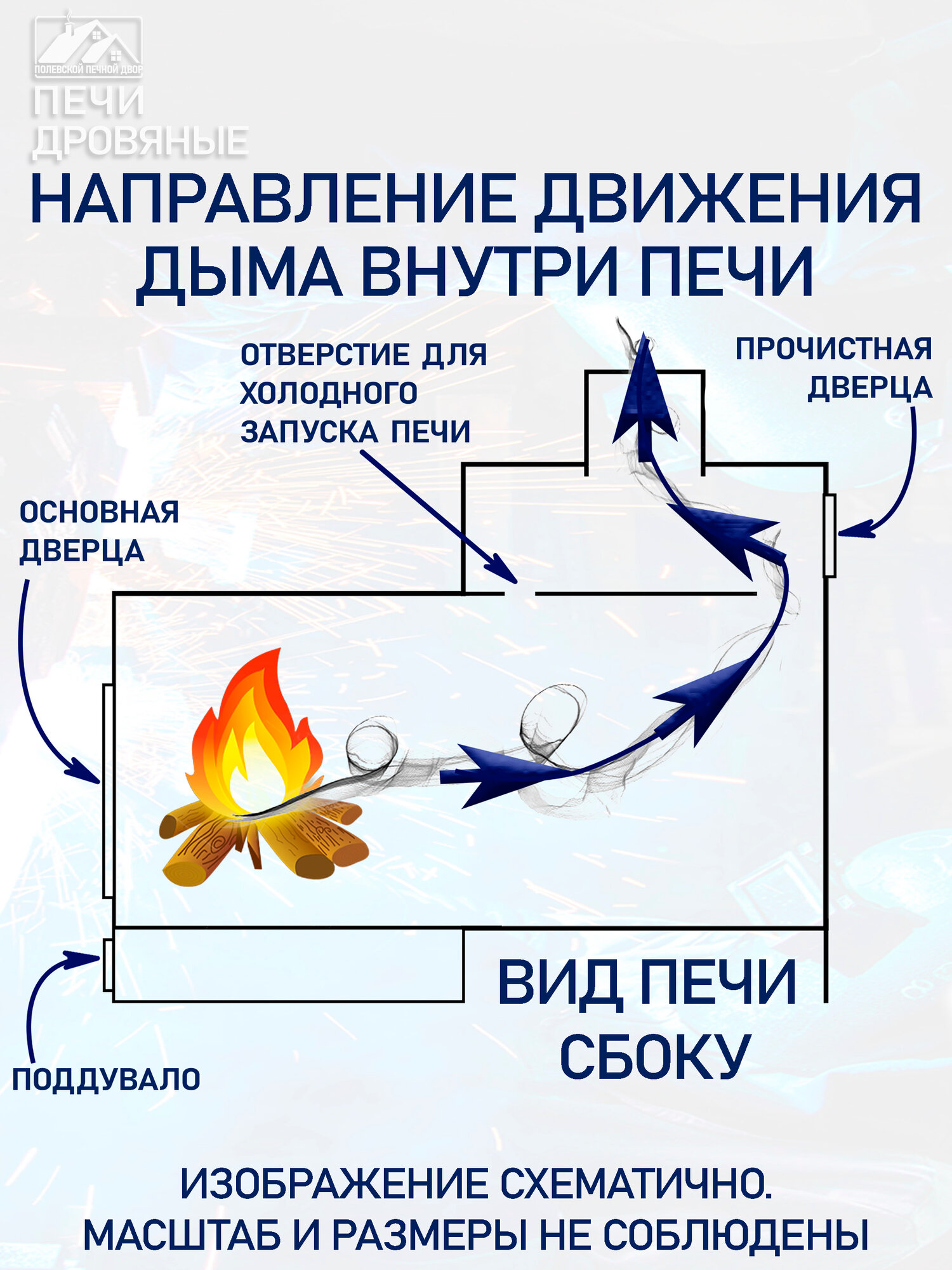 Диаметр дымохода внешний составляет 108 мм, что позволяет легко подключить печь к системе дымоходов.