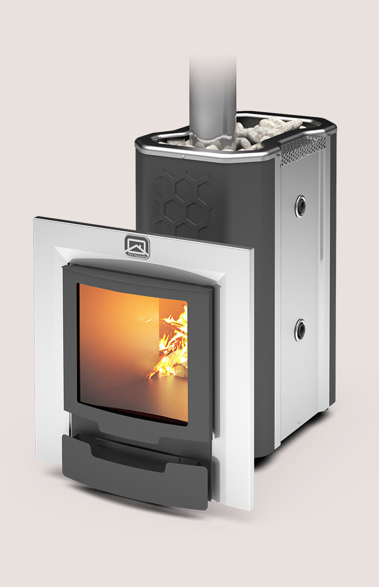 Сибирь очень мощная и эффективная. Камни в корзине каменки прогреваются с пяти сторон и дают много лёгкого пара. Выход дымохода у печи классический – смещенный к переднему краю печи. Такое расположение дымохода обеспечивает максимальный доступ к каменке.