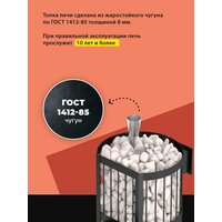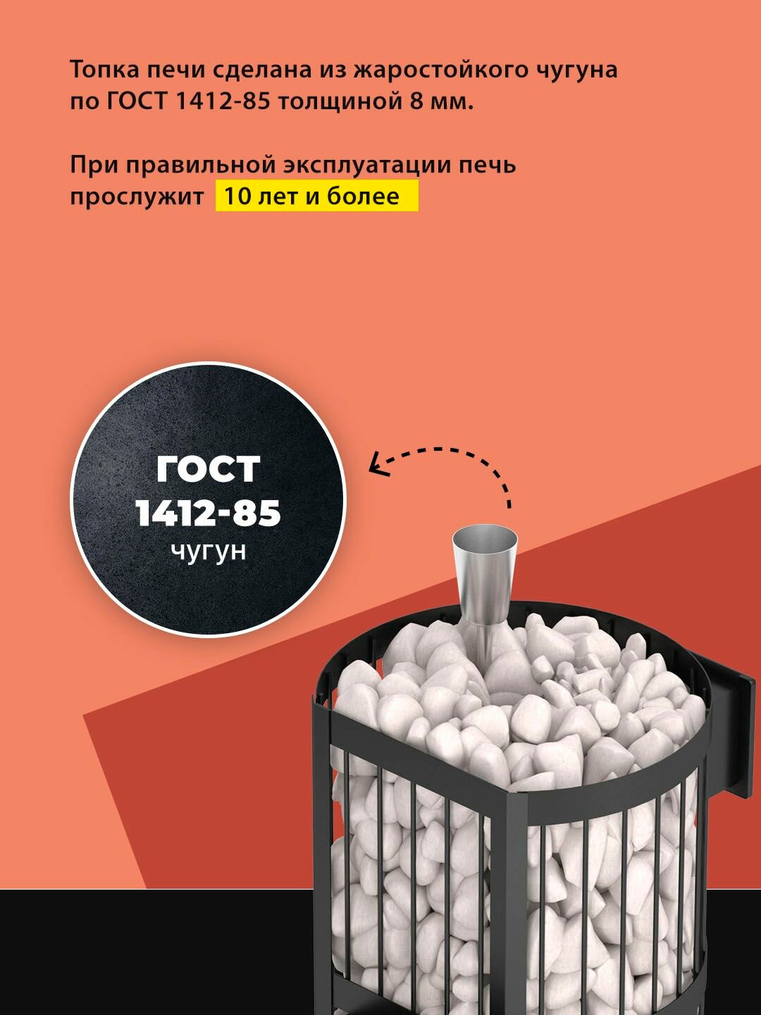 Топка печи сделана из 3-х чугунных элементов, что позволяет производителю заявлять срок службы - до 30 лет. Между элементами, при помощи термостойкого герметика, прокладывается термостойкий керамический шнур. Элементы топки соединены между собой болтовым соединением, что даёт 100% гарантию безопасности при эксплуатации.
