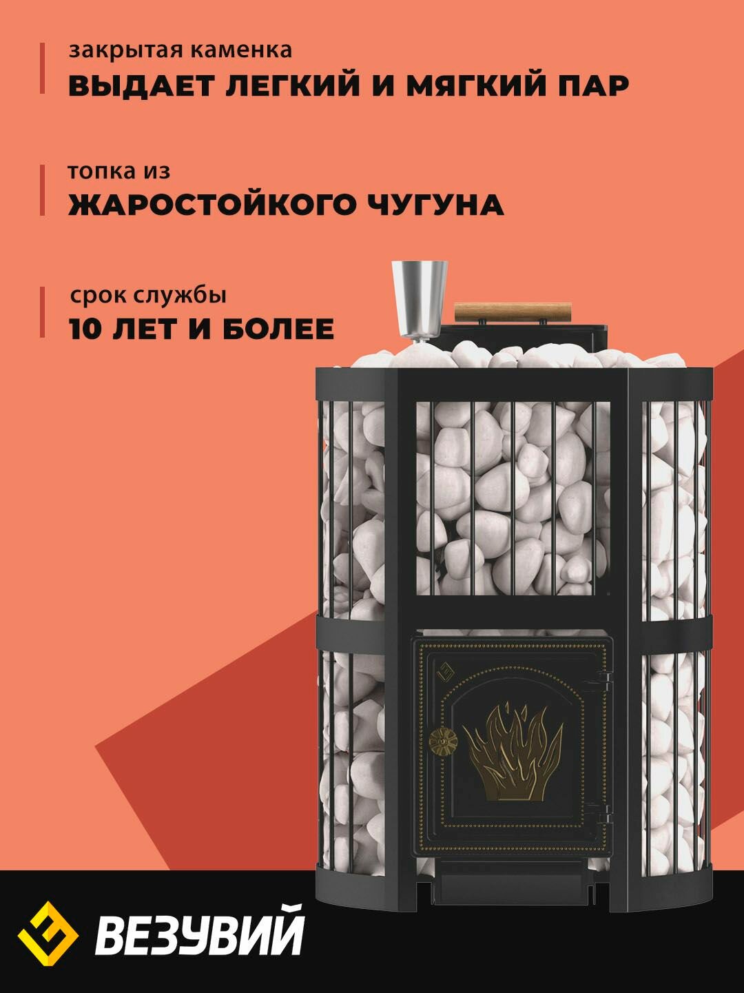 Топка печи сделана из 3-х чугунных элементов, что позволяет производителю заявлять срок службы - до 30 лет. Между элементами, при помощи термостойкого герметика, прокладывается термостойкий керамический шнур. Элементы топки соединены между собой болтовым соединением, что даёт 100% гарантию безопасности при эксплуатации.