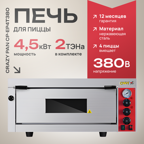 Купить Печь для пиццы Crazy an CP-EP4T380, 4.5кВт, 380В, 4 пиццы 30 см, размеры печи 950x905x420мм, 1 уровень, температурный режим от 0-500 градусов с доставкой по всей России.