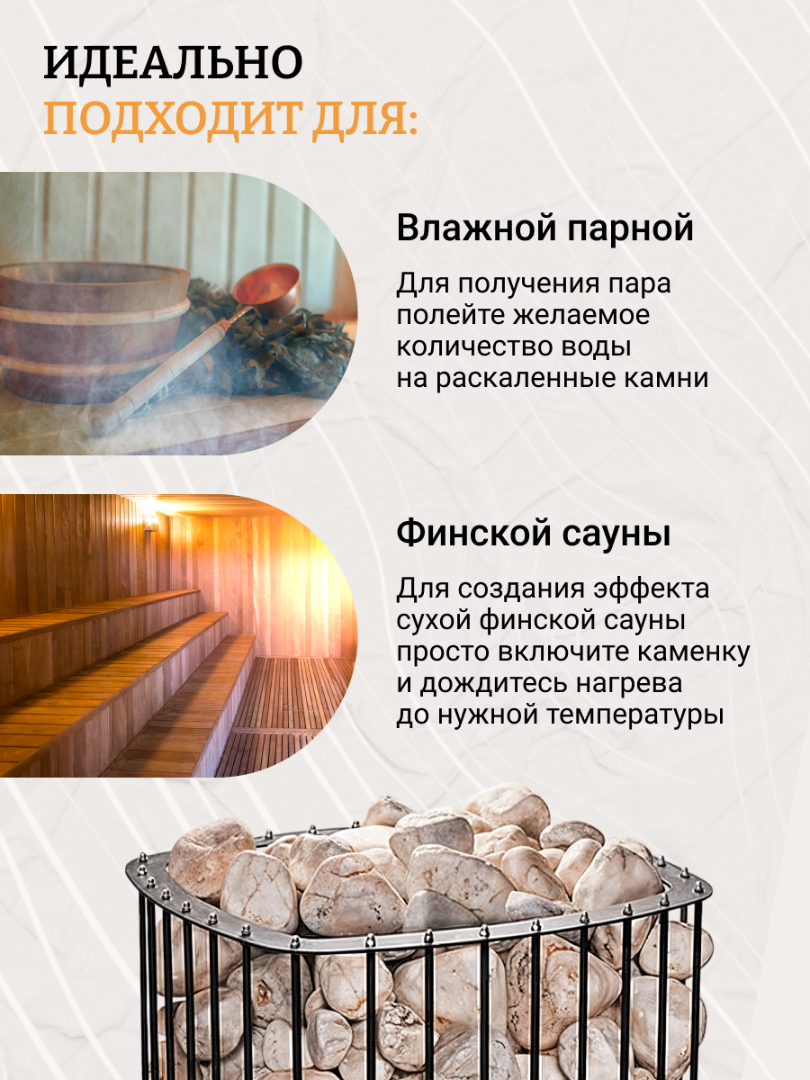 Одним из основных преимуществ данной печи является отсутствие пульта управления. Это значит, что вы сами можете регулировать температуру и время нагрева, полностью контролируя процесс саунирования. Благодаря этому вы сможете настроить все по своему усмотрению и сделать процедуру максимально комфортной и эффективной.