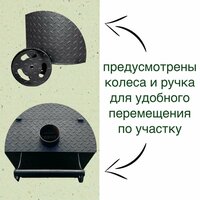 Печь оборудована колесами для удобства перемещения по участку, а разборная конструкция позволяет легко транспортировать и хранить печь. Вес печи составляет 63 кг, что делает ее достаточно легкой для перемещения, но при этом устойчивой и надежной.