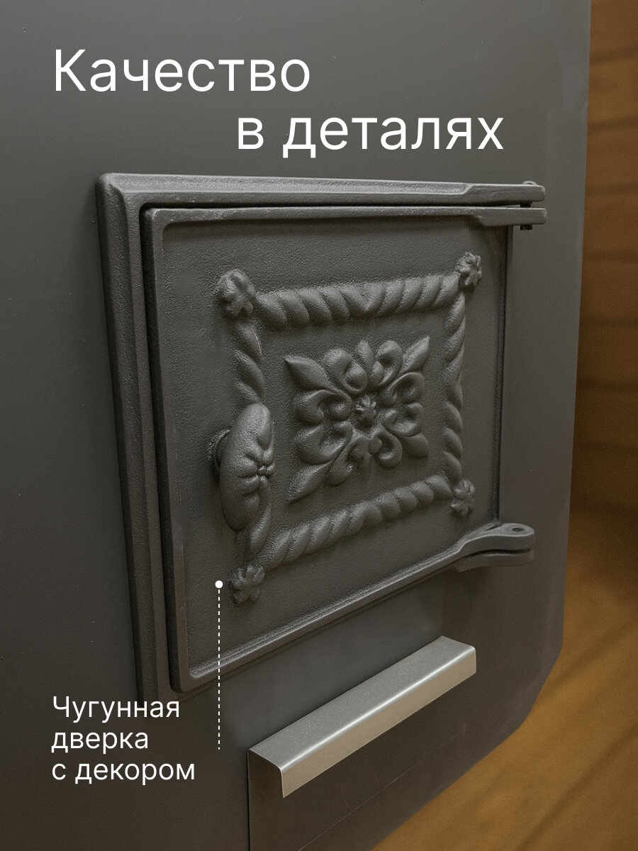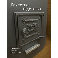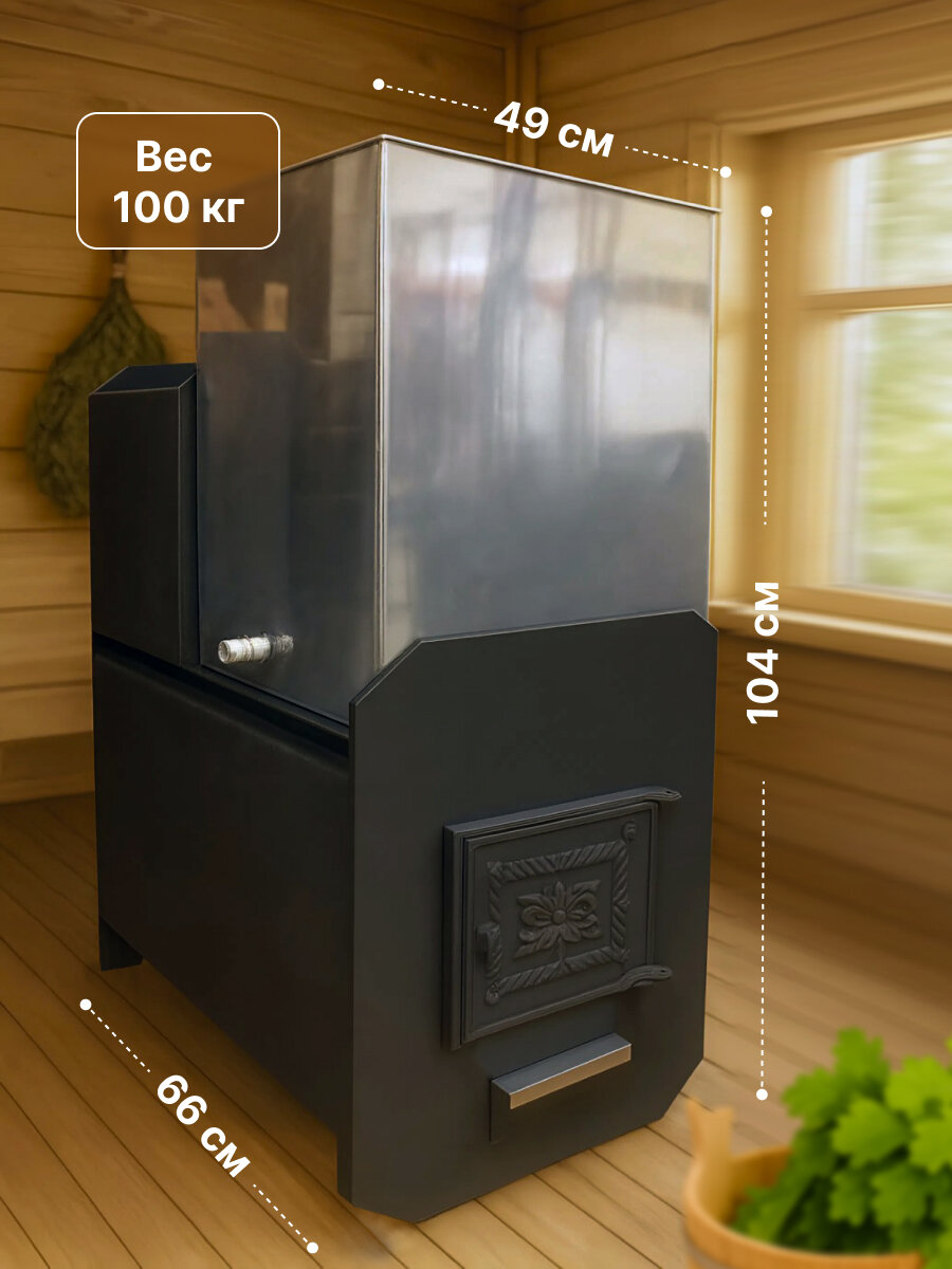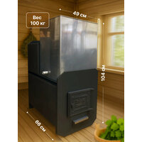 Гермес 24 относится к классу банных печей «Топи и мойся», так как топка печи осуществляется в самом парном помещении , имеет в комплекте бак из нержавеющей стали объемом 70 л, установленный непосредственно на самой печи. Конструкцией печи предусмотрен демонтаж бака для его помывки или при желании можно убрать его совсем. В боковой нижней части бака для воды установлен сливной штуцер размером ¾ дюйма, для установки крана. Топка печи изготовлена из трубы диаметром 426 мм, толщиной металла 8 мм, что позволяет эксплуатировать печь более 10 лет еженедельно. В самом энерго-напряженном месте печи - на задней стенке, установлен пластина — отбойник толщиной 4мм, который усиливает заднюю стеку и не дает горящим дровам соприкасаться с ней, тем самым увеличивается срок службы печи. Для пожарной безопасности, увеличения скорости нагрева каменей и парного помещения в месте выходы дымовых газов установлен специальный «канал-дымооборот», который не дает дымовым газам напрямую выйти в трубу. На самом «дымообороте» установлено специальное прочистное отверстие для удаления скопившейся сажи. Большая открытая каменка вмещает в себя более 80 кг. камней. В печи Гермес 20 конструкторами предусмотрены боковые кожуха-конвекторы, которые увеличивают скорость нагрева парного помещения, убирают жесткое экранирование от раскаленной топки печи, создающие неприятный «обжигающее» ощущение. Большой литраж токи и дрова длиной до 600 мм, позволяют реже подходить к печи во время ее работе. Внутри топки для регулирования интенсивности горения установлен чугунный колосники, через который подается кислород в зону горения, интенсивность подачи кислорода регулируется зольным ящиком — совком. Дверца-чугун Объем парной, куб. м.24 объем бака, л.70 ТИП каменки-открытая ТИП бака-нержавейка