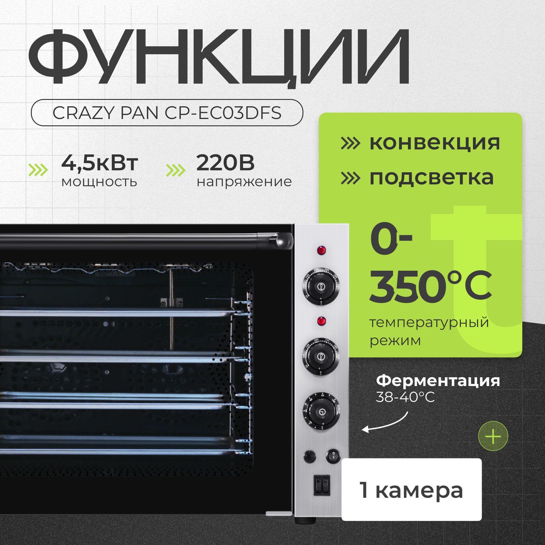 Купить Печь электрическая конвекционная Crazy Pan CP-EC03DFS, 4.5кВт, 220В, пароувлажнение (подключение к водопроводу) с доставкой по всей России. Печь электрическая конвекционная Crazy Pan CP-EC03DFS, 4.5кВт, 220В, пароувлажнение (подключение к водопроводу): сравнение цен, характеристики, фото, актуальное наличие и цены.