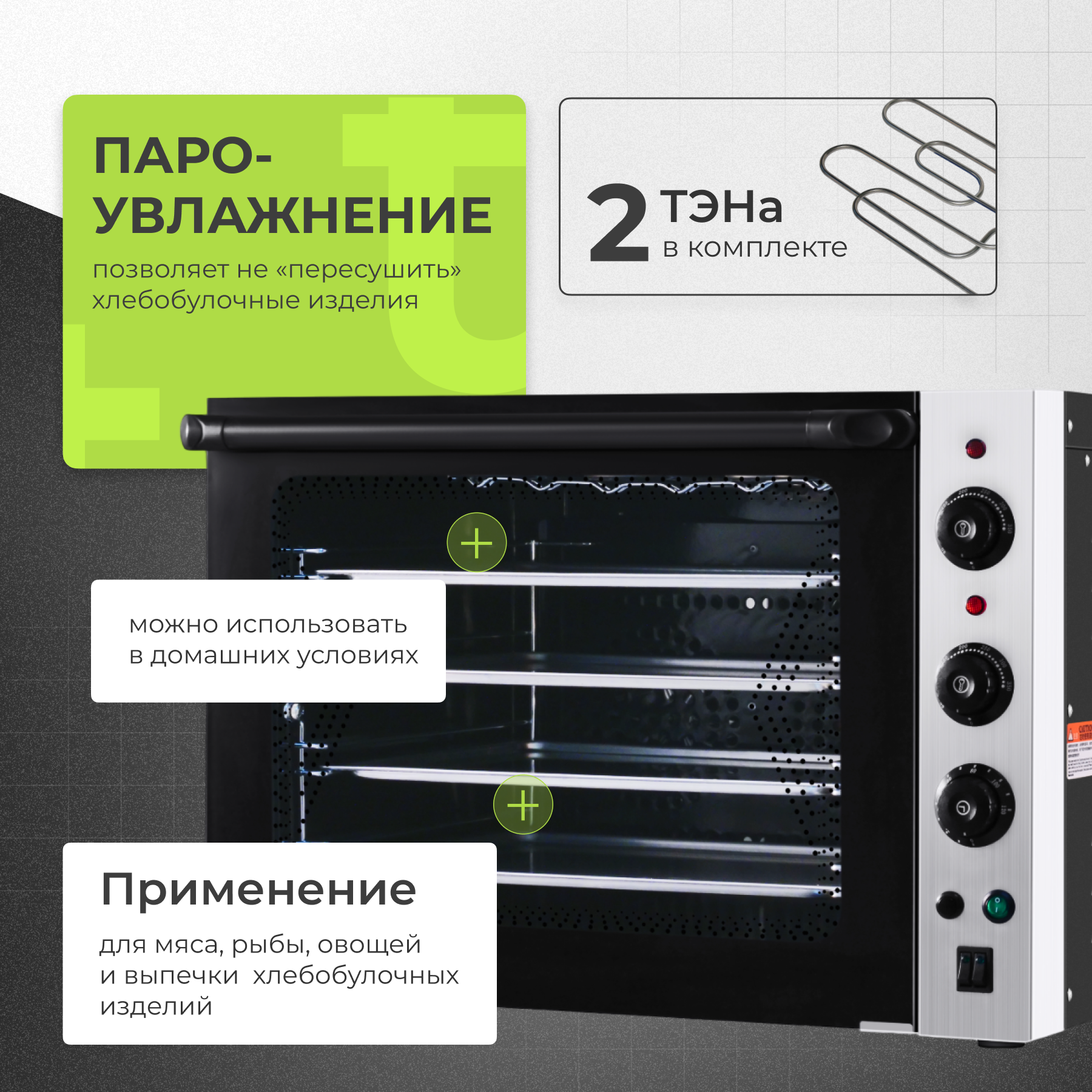 Печь оснащена двумя ТЭНами мощностью 4,5 кВт, что обеспечивает быстрый нагрев и равномерное распределение тепла по всей камере.