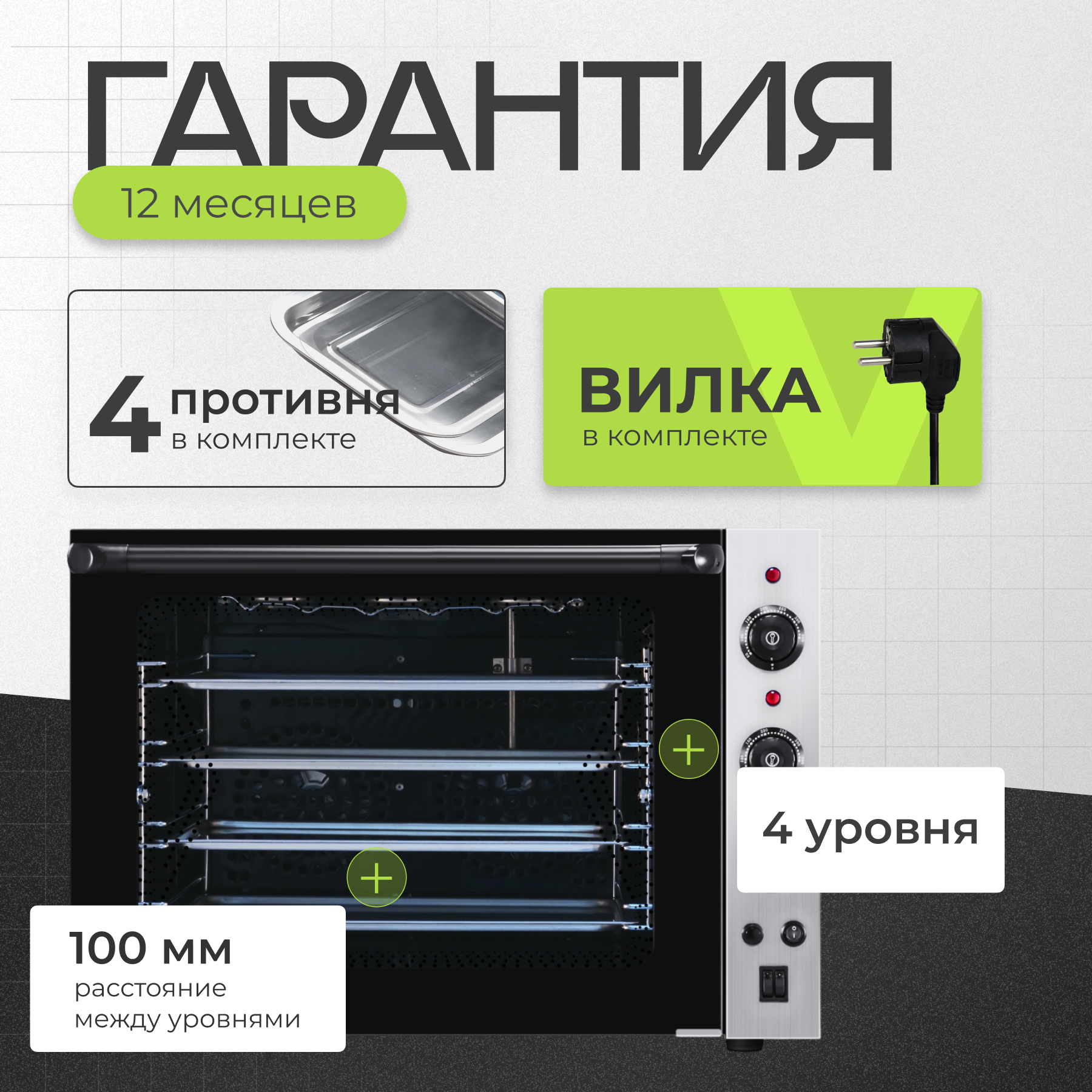 противни - 4шт, вращающаяся тарелка для прогрева приготавливаемой еды со всех сторон, пароувлажнение (требуется подключение к водопроводу через фильтр)