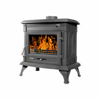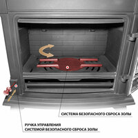 Печь-камин предназначена для обогрева помещений объемом до 260 м³. Топочная камера ограничена двойными чугунными стенками сзади и по бокам, что обеспечивает равномерное распределение тепла. Нижняя панель представляет собой колосниковую решетку с поворотным механизмом, что позволяет легко сбрасывать излишки золы и мелких углей в зольный ящик.