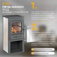 Конструкция печи-камина этна БКД с плитой разработана с учётом необходимости быстрого разогрева помещения и последующего длительного поддержания теплового комфорта в загородном доме, на даче или в другом ограниченном пространстве. Этна БКД рассчитана на пристенное размещение. Чугунная плита обеспечивает приготовление или разогревание еды. Теплообменник обеспечивает работу контура водяного отопления на площади до 100 квадратных метров.
