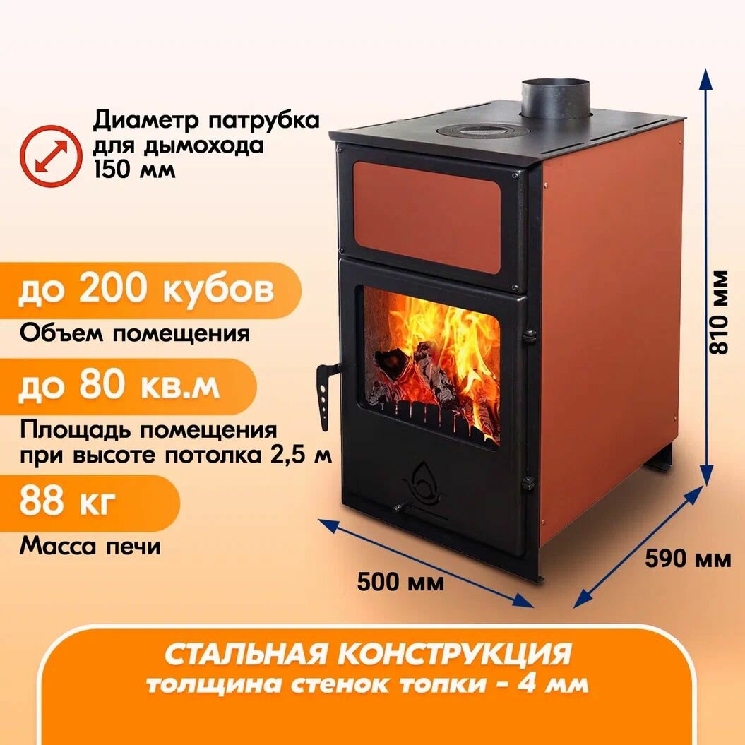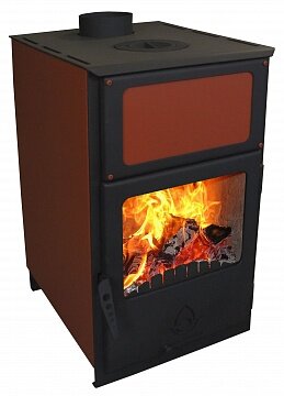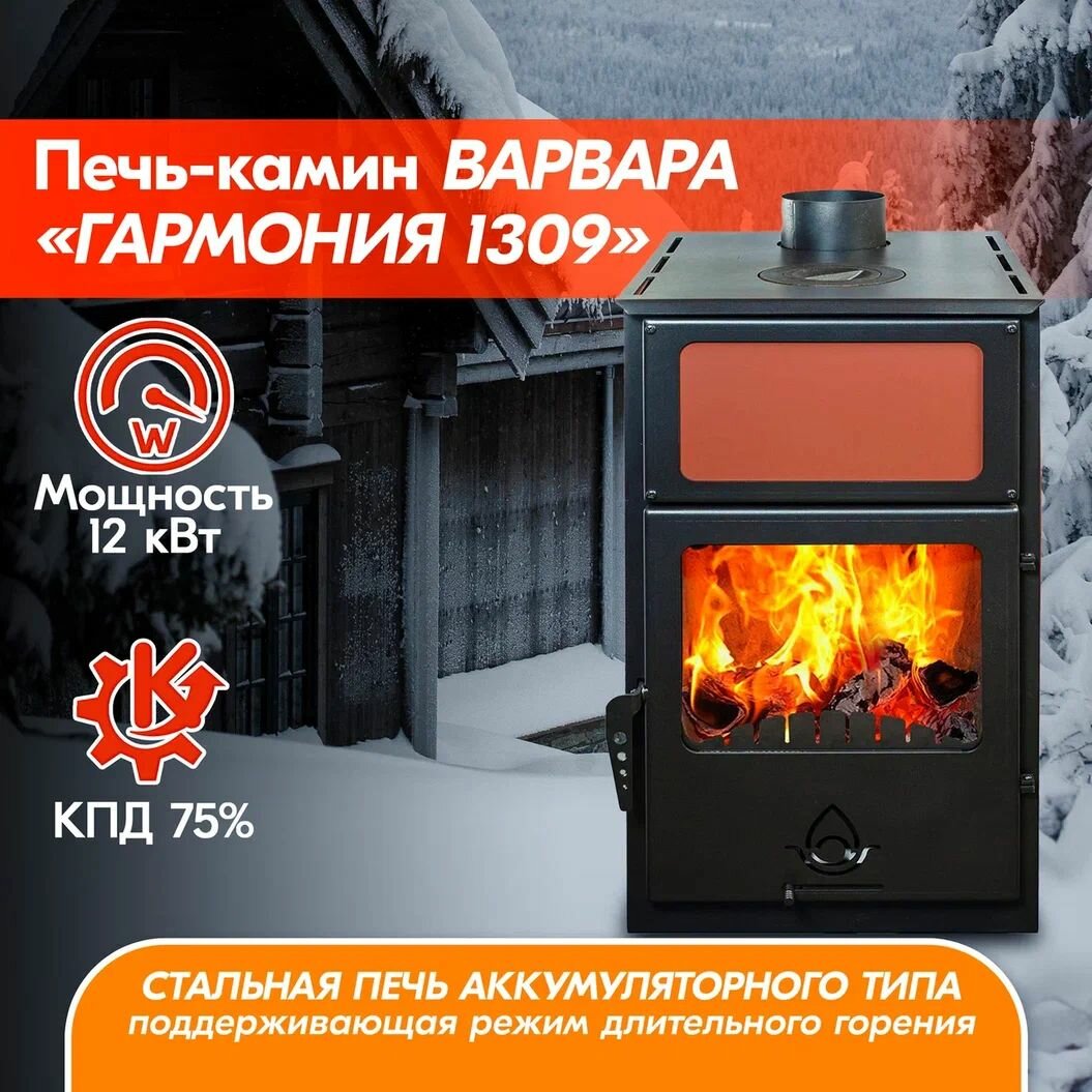 Печь камин гармония 1309 является дровяным камином аккумуляторного типа. Это подразумевает собой то, что при прекращении горения внутри печи – тепло еще продолжительное время сохранятся в ней и плавно отдается в помещение. Во внешней части печи, вдоль дымового канала под верхней крышкой, находятся специальные карманы, в которые помещается 16 печных кирпичей. Эти карманы специально сконструированы вдоль конвекционных каналов, чтобы циркуляция воздуха была постоянной. Также, как засыпной карман может использоваться и отбойник печи. Его же можно заполнить не только кирпичом, но и другим аккумулирующим материалом (например, песок), что также повлияет на продолжительную работу печи после прекращения горения внутри нее. Еще одним положительным качеством, является использование дров длиной до 520 мм. На верхней крышке печи находится варочная панель для приготовления пищи. Данная модель, дополнительно может комплектоваться специальным подиумом дровницей, которы