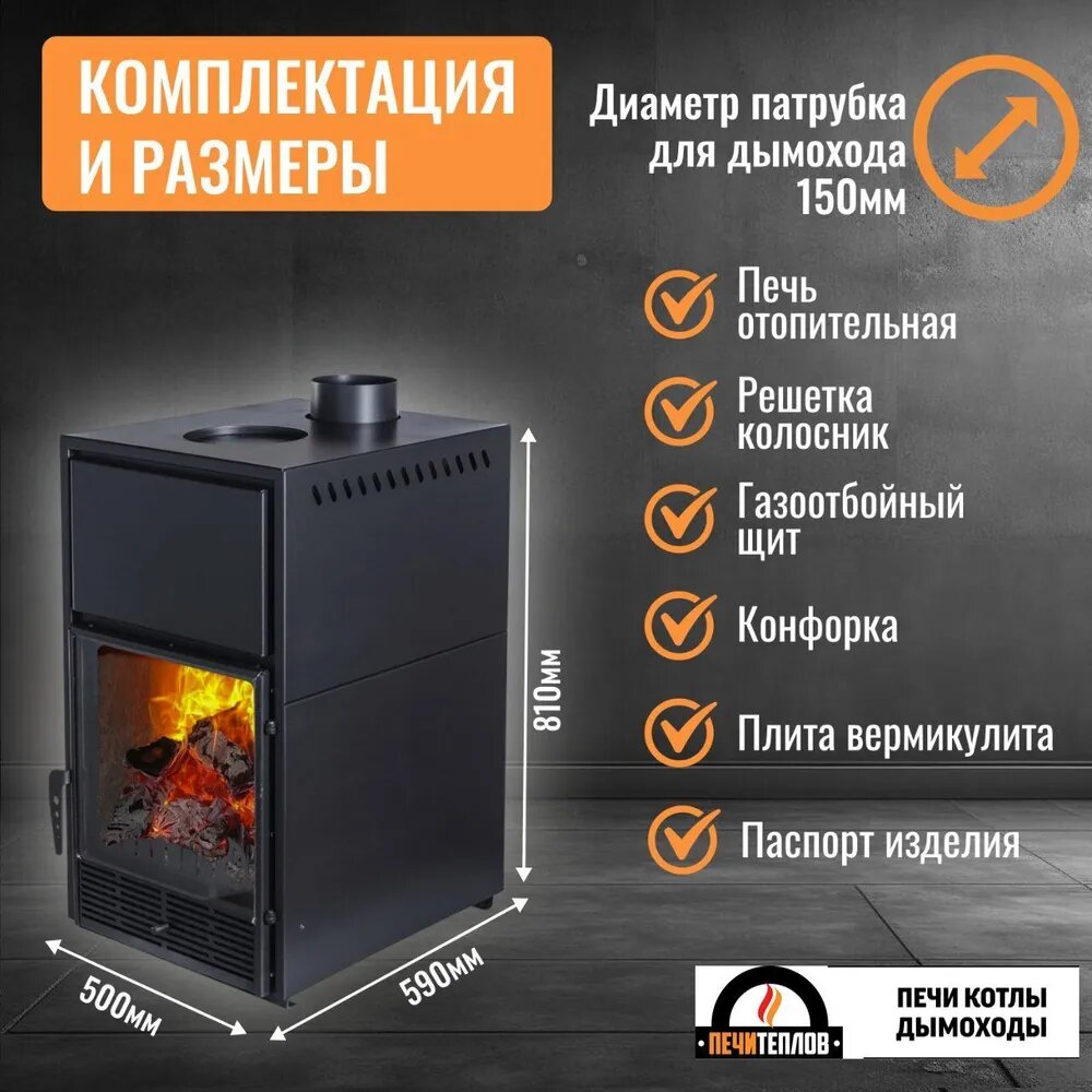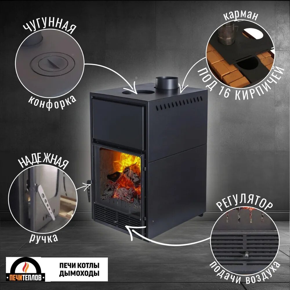В верхней части топочной камеры дровяной печи-камина находится варочная панель для приготовления пищи, оборудованная двумя съёмными дисками. Высота печи обеспечивает удобство пользования варочной поверхностью.