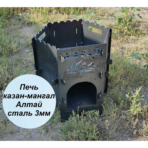 Печь алтай "Казан-Мангал" под 8 литровый казан. Многофункциональная разборная печь «три в одном». Удобная в перевозке. Варианты использования: - как мангал для приготовления шашлыков; - как печь для приготовления пищи на плите; - как печь для приготовления пищи в казане; Печь может использоваться как уличный очаг. Изготавливается из г/к стали марки Ст3 толщиной 3 мм.
