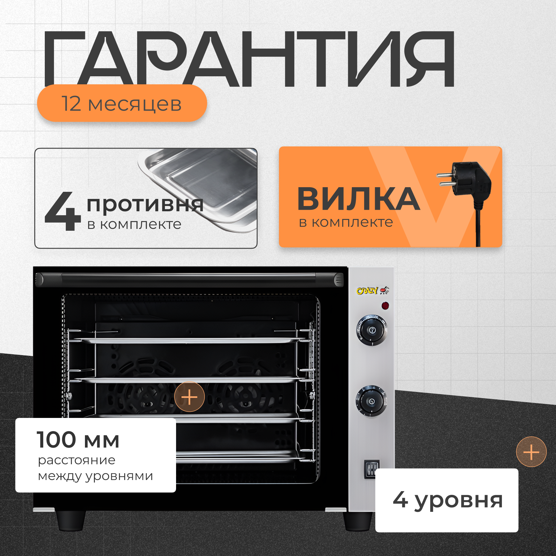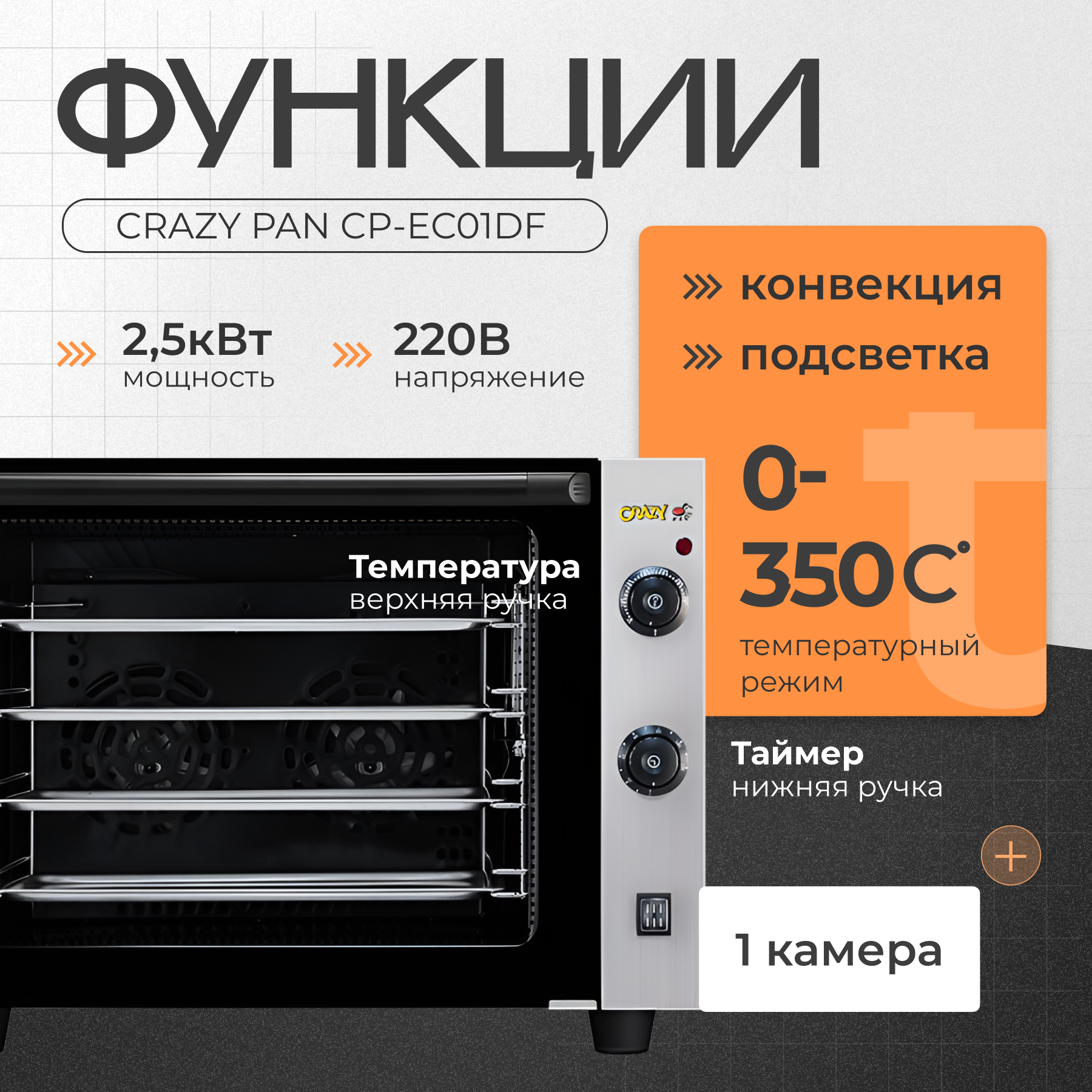 Купить Печь электрическая конвекционная Crazy Pan CP-EC01DF, 2.5кВт, 220В, 4 уровня, камера 460x370x350мм, вилка в комплекте с доставкой по всей России. Печь электрическая конвекционная Crazy Pan CP-EC01DF, 2.5кВт, 220В, 4 уровня, камера 460x370x350мм, вилка в комплекте: сравнение цен, характеристики, фото, актуальное наличие и цены.